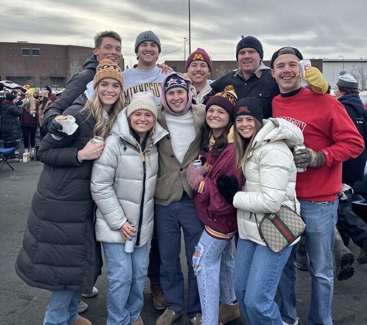 Red Knights for Gophers & Badgers: A group of 2018 BSM grads tailgated before the Gopher vs. Badger game on Nov. 25th. Back row: Turner Wine, Carter Uphus, Quinn Ehlen, Joe Dunn & Tommy Anderson