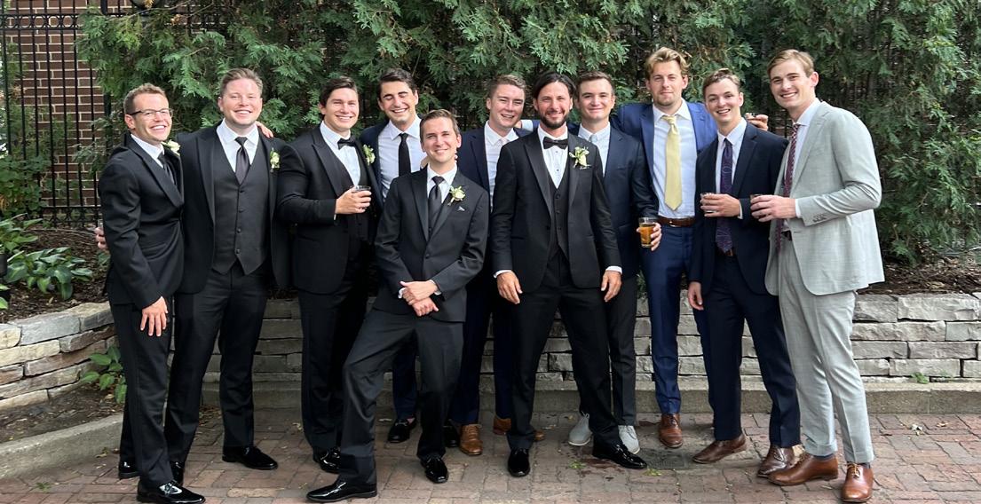 Wedding Gathers Red Knights: Classmates from 2014, from (l-r): Wyatt Satre, Thomas Stone, Josh Werkmeister, Michael Lamb, Grant Anderson, Will Jarvis, Casey Hansen (their favorite BSM PE teacher and brother-in-law to Carter), Jacob Donlin, Eric Stanley, Michael Patton, and Michael McGill joined Carter Burn and his new wife Nicole to celebrate their marriage.