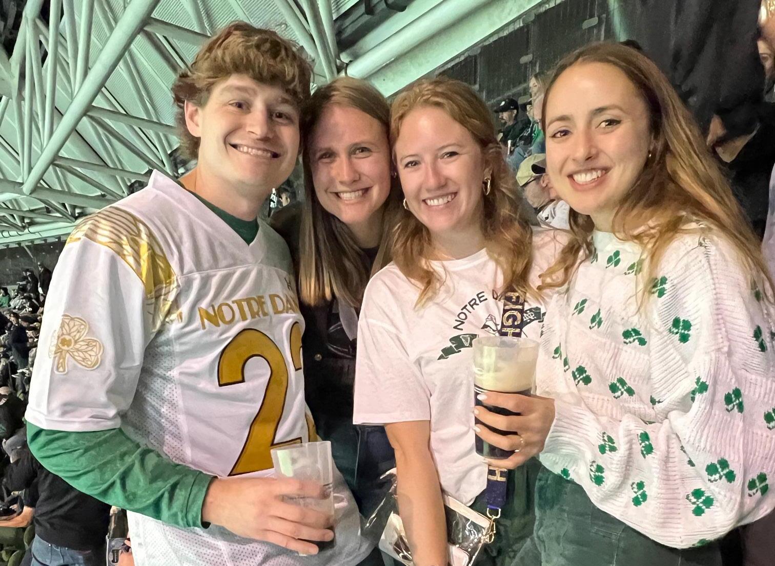 Mikey Koller ‘13, Anne Arneson ‘13, Elle Scott ‘13, and Katie Sisk Koller ‘13 cheered on the Fighting Irish on August 26 in Dublin, Ireland at the Notre Dame/Navy game.