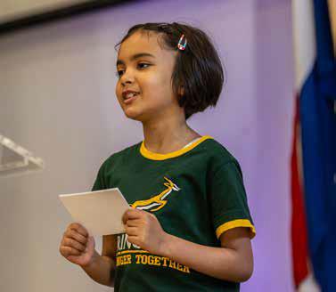 A f e w st ud e n ts w ere se l ecte d t o s h are t h e i r s p eec h e s und er t h e s p ot ligh ts du r ing o u r assem bli es. Eac h s p ea k e r too k u s o n a n e x c i t ing j o u r n e y , h o lding o u r atte n t i o n a n d d emo n strat ing co nfid e n ce a nd s p ea king s kill s. On e o f o u r st ud e n ts, A ara yn a, in Year 3 , ama z e d h er a udi e n ce wi t h h er s p eec h a bou t h er f am ily co nn ect i o n s to S o u t h Af r i ca