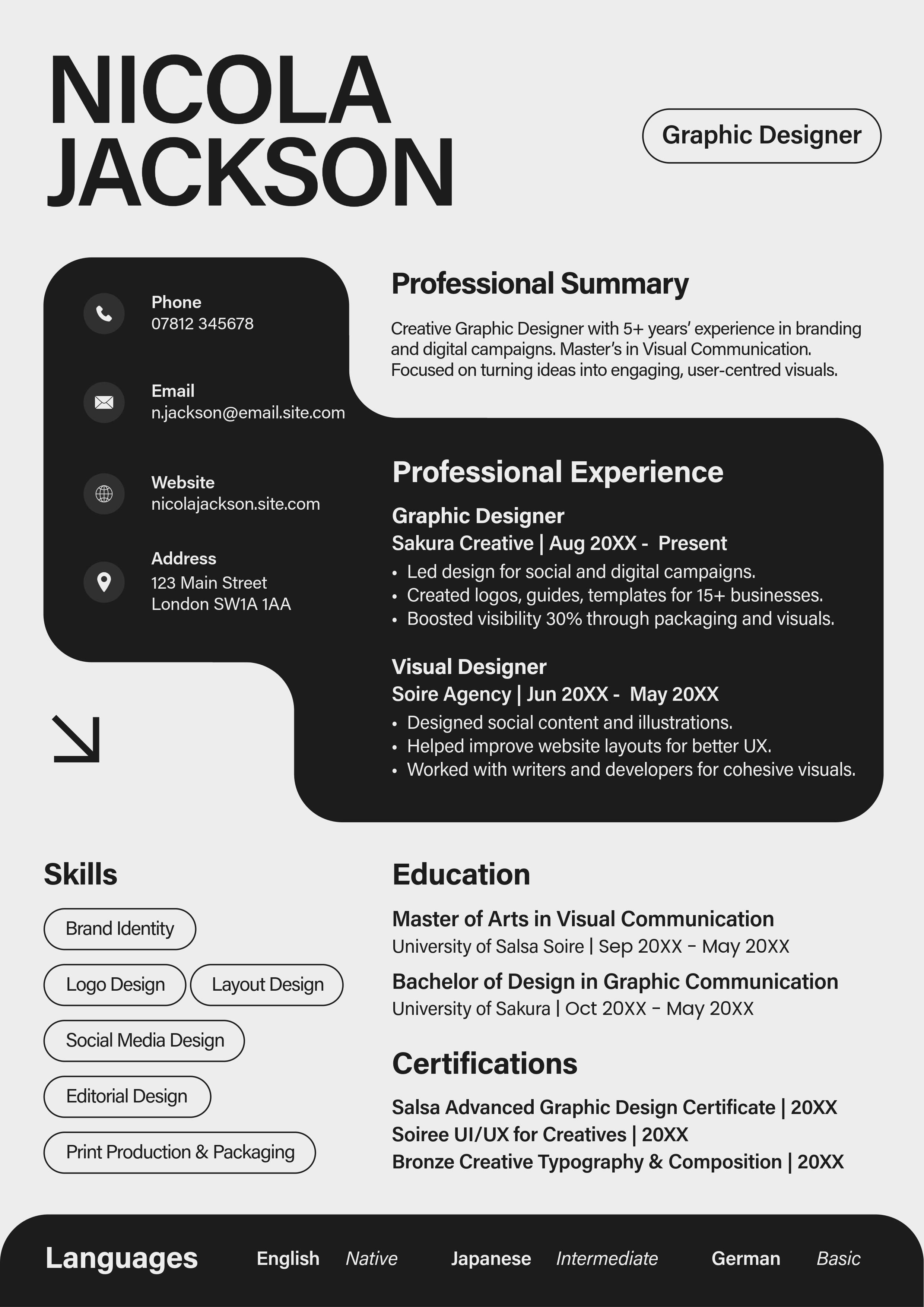 When arranging written text make sure it's readable and appealing. You may want to consider the typeface you use, font size, line-length, and line-spacing. Typography will be particularly important for graphic design companies reviewing your CV.