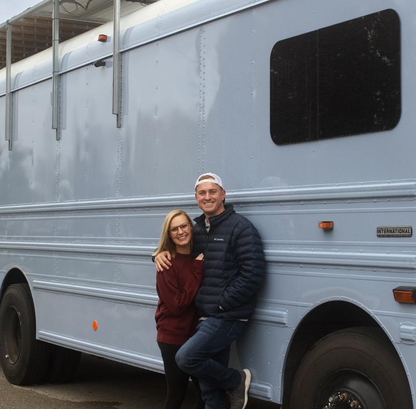 Kyle’s research began. He learned all about the best places to buy a bus, as well as the best engine and tire types for longdistance travel. He even developed a list of all their necessities as a traveling couple, including a rooftop deck, security cameras, and a raised ceiling to accommodate for showering and his height.