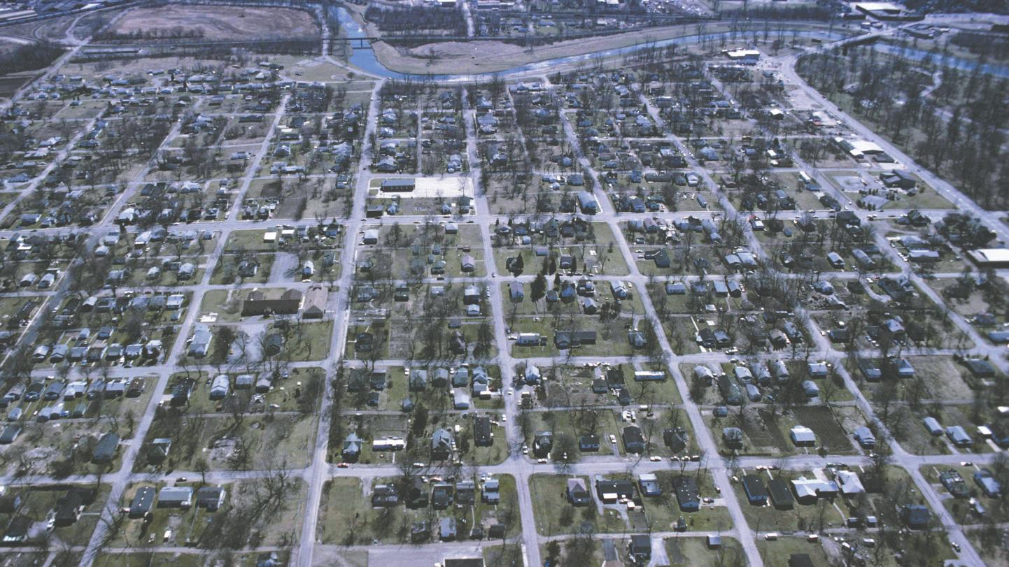An aerial view of Whitely neighborhood March 1987 in Muncie, Ind. Historically, the neighborhood has been home to the Black community in Muncie. Ball State University Digital Media Repository, Photo Provided