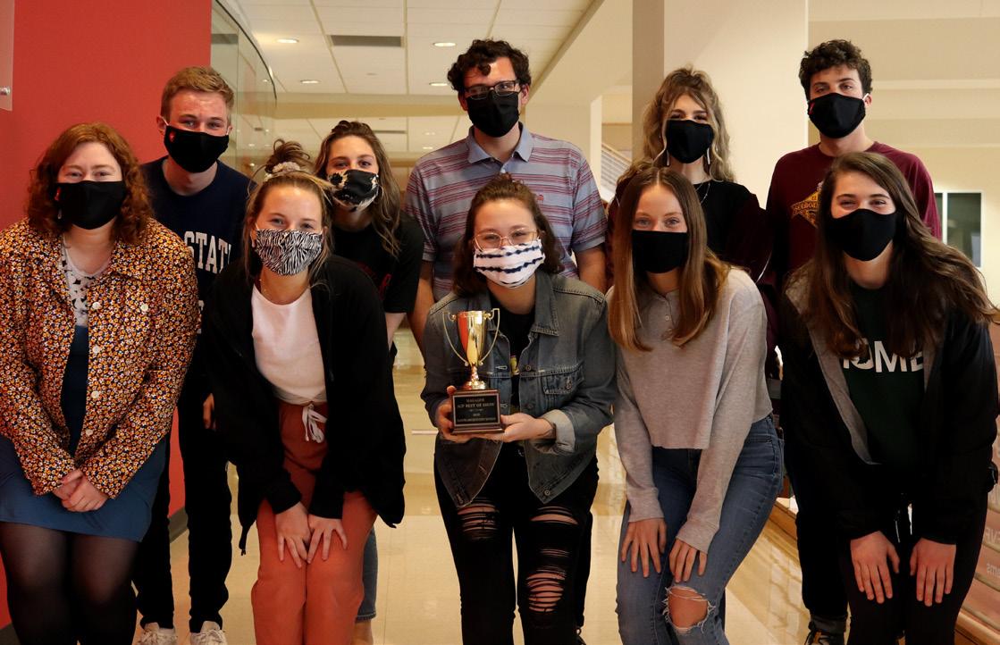 The Ball Bearings exec team poses with their 2020 Best of Show award from the American Collegiate Press.