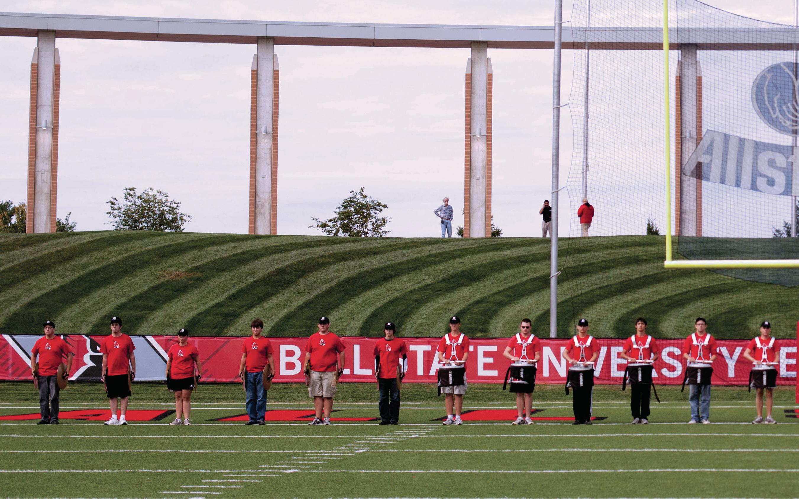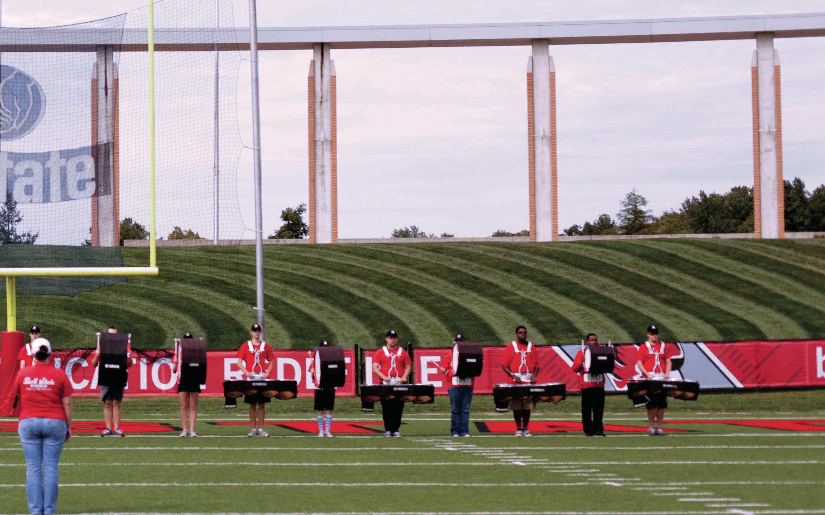 Acool, crisp autumn wind blows across Scheumann Stadium as the final beats resonate from the drums. The last bass note echos through the entire stadium. It’s quiet, and the “Pride of Mid-America” is frozen in place, instruments down, waiting for approval from their director.