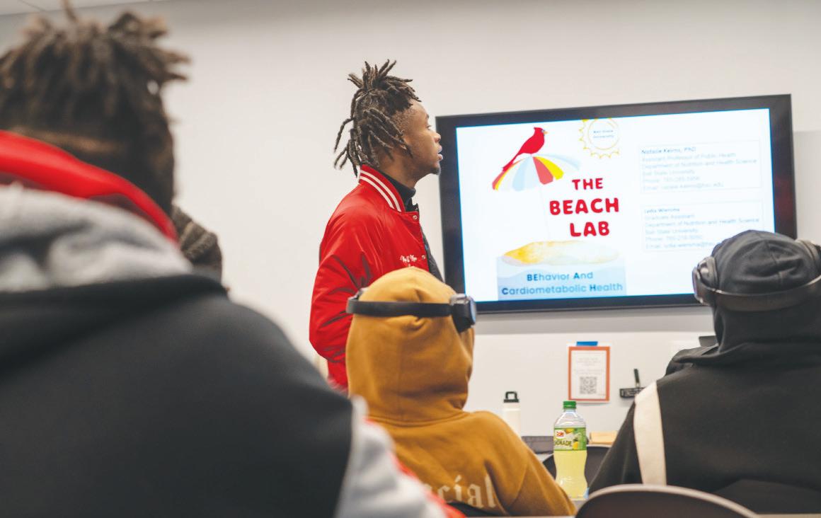 Fourth-year psychology major Elijah Newman introduces an activity challenge to Man 2 Men members during a meeting Feb. 17 at the Multicultural Center. The group challenge for attendees addresses the methods of approaching romantic scenarios.