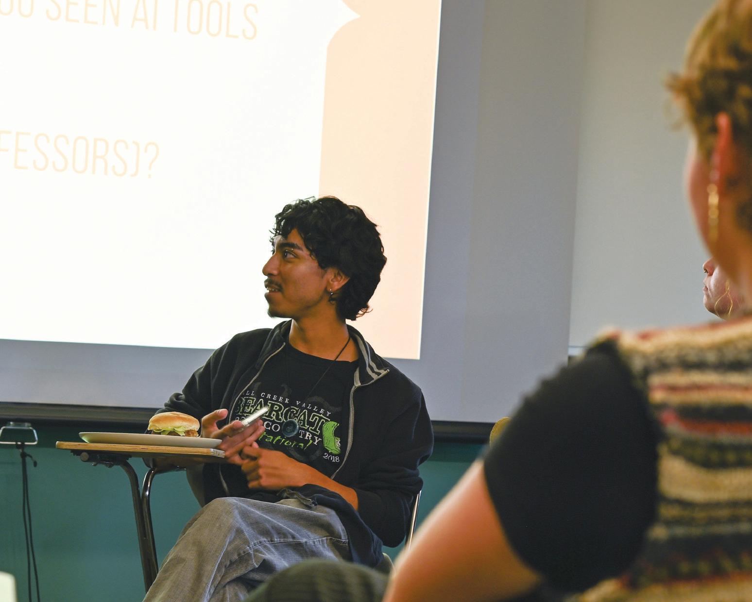 The conversation was moderated by Lancaster, who sat at the head of the classroom and presented the question for the group: “In what ways have you seen AI being used around campus?”