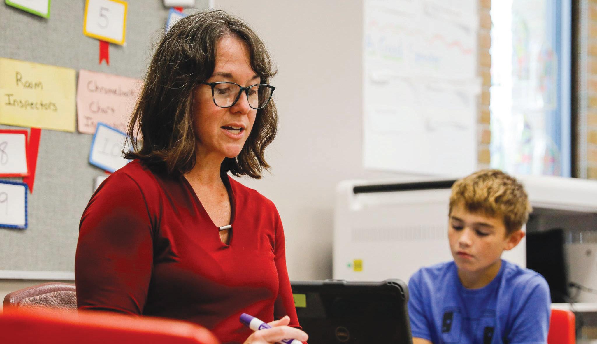 Fourth grade teacher Heather Veatch works on division with her students Oct. 1, 2024 at East Washington Academy. As of Sept. 29, 2024, there were 2,708 unfilled positions through the Indiana Educator Job Board. ANDREW BERGER, DN