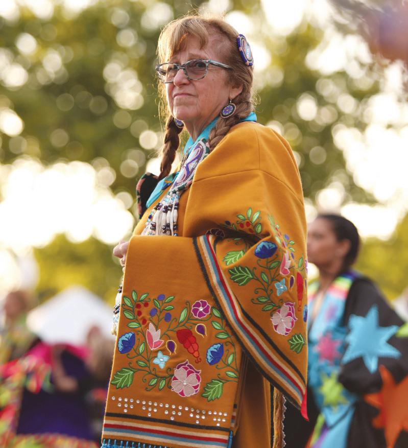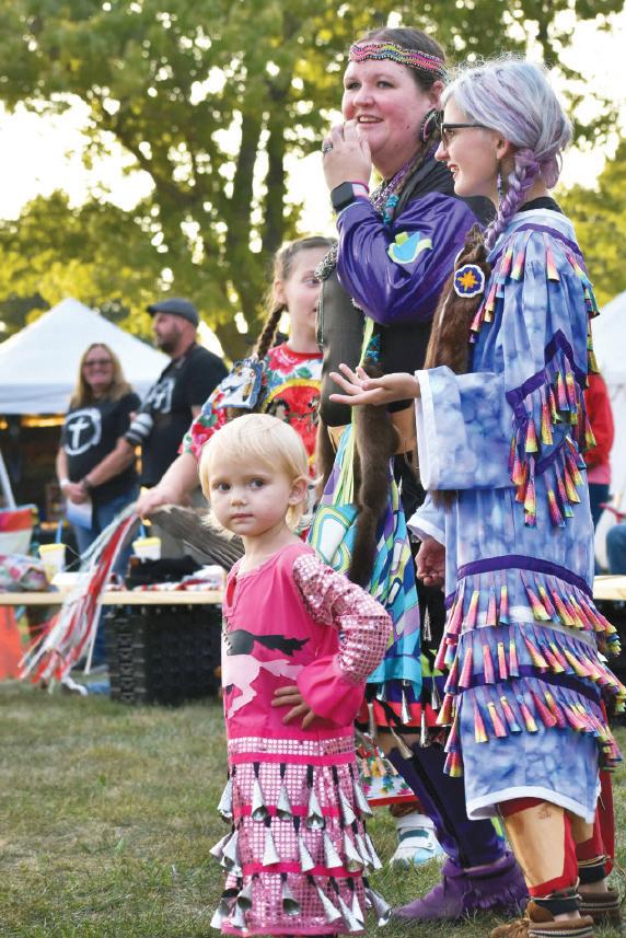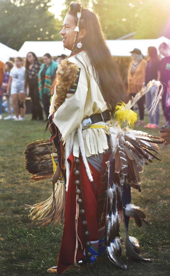 Dancers gather in the arena during the Andersontown Powwow at Beulah Park in Alexandria Sept. 9. Non-tribal members earn the right to wear traditional regalia by routinely attending powwows. HEATHER PARKER, DN
