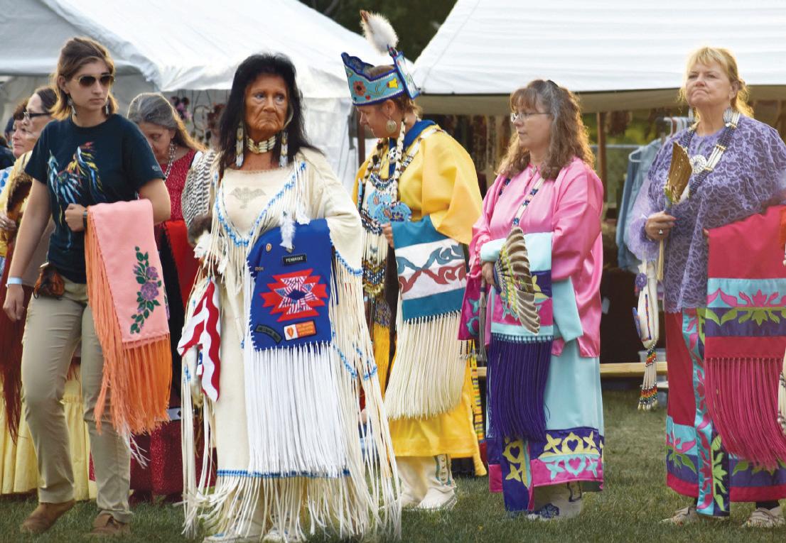 A group of dancers stand in the arena during the Andersontown Powwow at Beulah Park in Alexandria Sept. 9. The Powwow is an inter-tribal celebration and welcomes all dancers to join in the arena HEATHER PARKER, DN