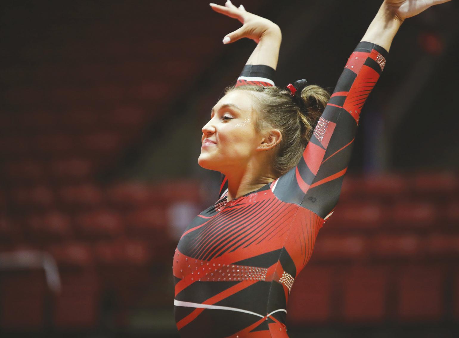 Northern Illinois Feb. 12 after a slow start in the second rotation to earn their ninth consecutive head-to-head win.Fourth-year Taylor Waldo poses before starting her floor routine at a meet against Northern Illinois Feb. 12 at Worthen Arena. Waldo scored 9.850 on floor. AMBER PIETZ, DN