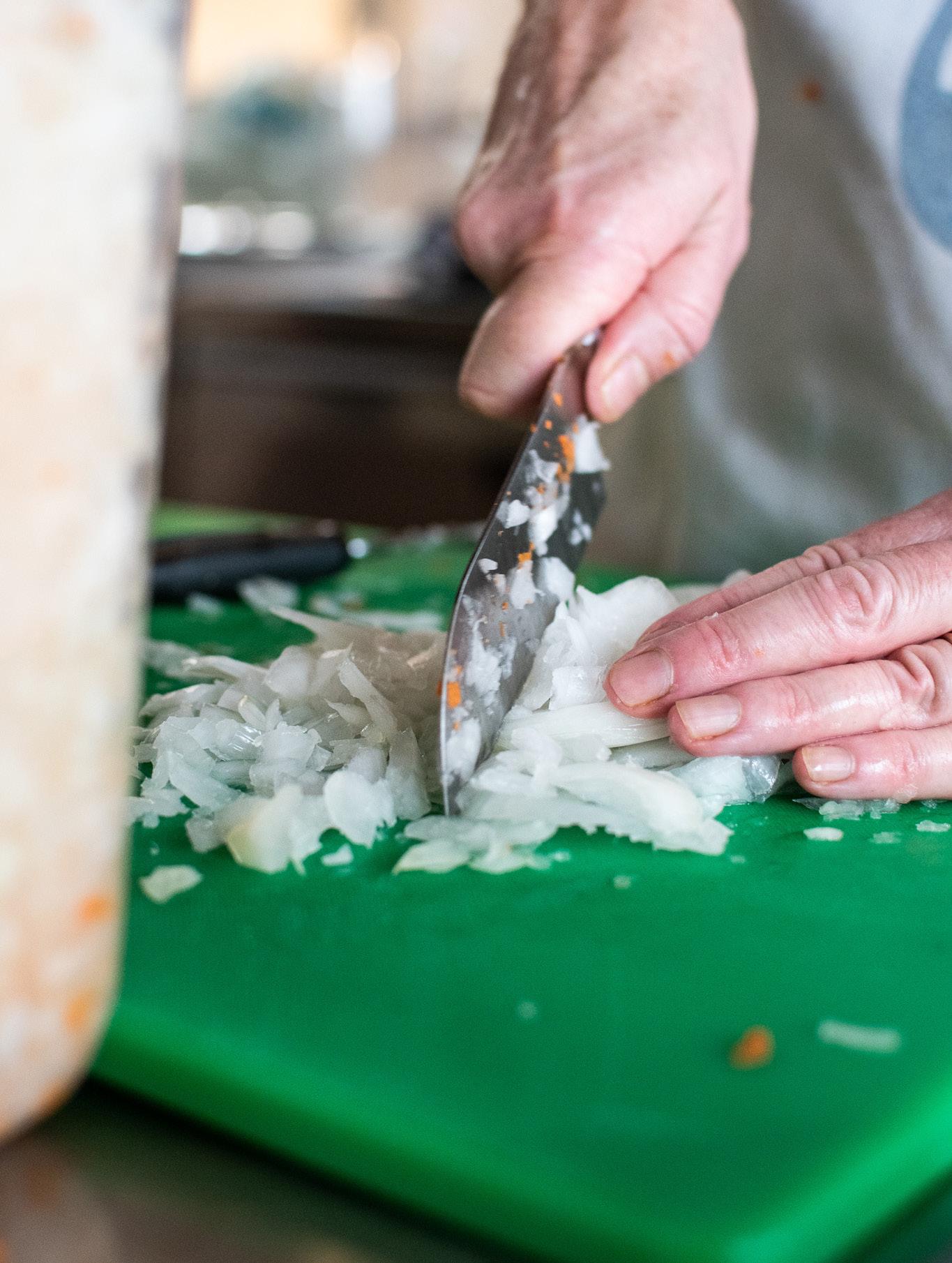 Kate Crow chops onions to mix in with her lasagna soup. She had tools to help dice, but she came in manually before adding them in. Shannon McCloskey, Ball Bearings