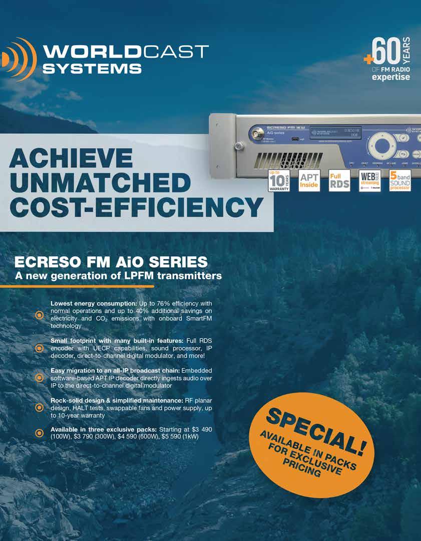 Ecreso FM AiO Series is a feature-rich 100W to 1kW digital FM transmitter that exceeds all expectations for new-gen FM radio broadcasting. Ideal for LPFM broadcast operations, this ultra-reliable transmitter offers ease of deployment, top-tier features, superior sound quality, and unbeatable pricing. With a single transmitter you will have your hands on a combination of advanced features (e.g. 5-band sound processor, APT IP Decoder with SureStream, APTmpX, full Audemat RDS Encoder, SmartFM) that streamline radio operations and make your life easier - less peripheral equipment, less maintenance visits, less points of failure, less carbon footprint.