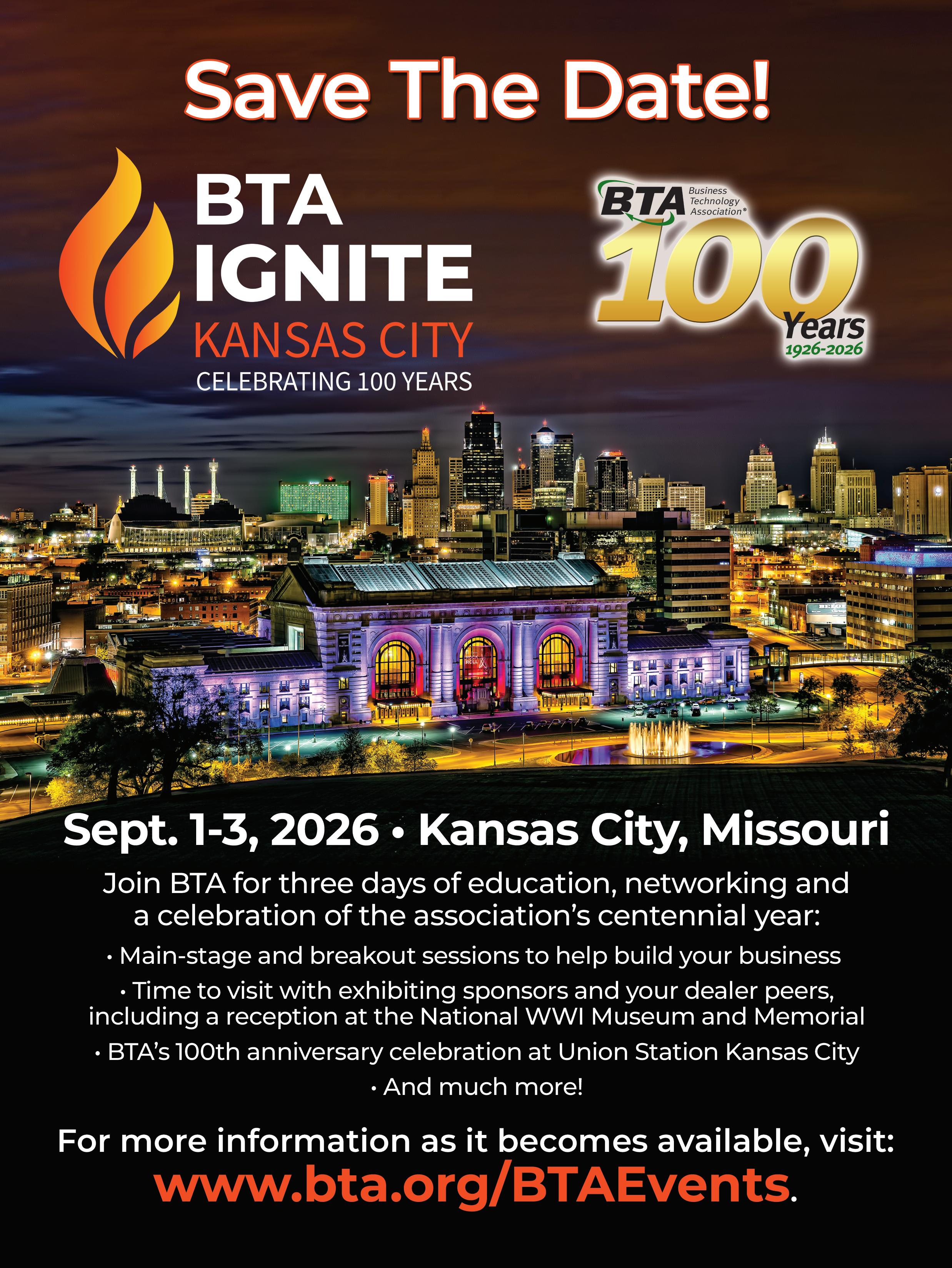 n Sept. 2: IGNITE all day; BTA at 100: A Celebration, honoring 100 years of BTA at Union Station Kansas City, in the evening n Sept. 3: IGNITE wraps up at noon