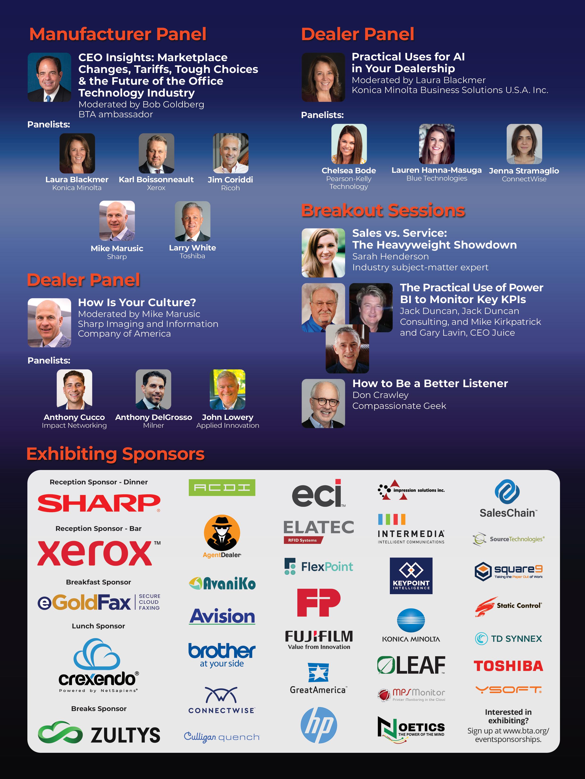 The BTA IGNITE Orlando event will begin at 9:30 a.m. on Friday, March 20, with opening comments and the first main-stage session — a manufacturer panel with insights from industry executives Laura Blackmer of Konica Minolta, Karl Boissonneault of Xerox, Jim Coriddi of Ricoh, Mike Marusic of Sharp and Larry White of Toshiba.