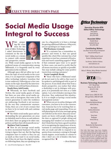 hile preparing the cover story for this issue of Office Technology, I asked interviewees to comment on the rise of social media as a means to connect with current and prospective customers. While social media appears to be the preferred means of communication among Millennials, it is frequently used by every generation in the workforce. Although space did not allow me to address the topic of social media in the cover story, it is an important component of the office technology industry transition that is now underway. Following are a few comments on the topic shared by the interviewees. I believe you will find them of interest. Randy Dazo, InfoTrends: n “Obviously, we have Facebook and Twitter, the social media giants of today, but there are now other social media options, such as Instagram, that some in the newest generation to enter the workforce are embracing; Facebook is not necessarily the way they communicate anymore. Today, there are a lot of new avenues that we have to be in touch with and continue to examine.” n “The whole social media space and understanding the new generations are areas we definitely need to focus on and embrace. If we don’t, there are going to be other competitors out there that will steamroll over us.” Matthew Vied, Lexmark: n “How do you leverage social media to drive incremental business? We are all trying to figure that out. But the big thing companies have to realize is they can say as much as they want to on social media, but if they do not have the digital customers following them, they are speaking to no