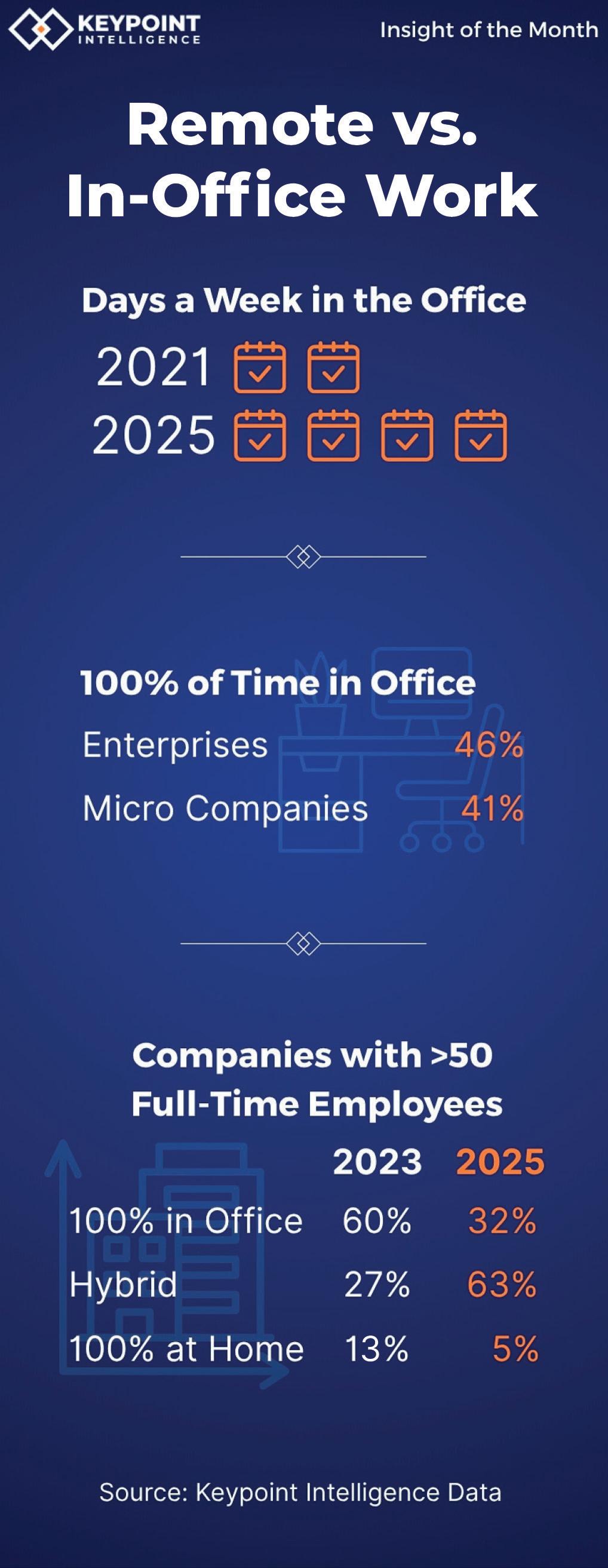 According to Keypoint Intelligence research, roughly 40% of knowledge workers in the United States now work in hybrid arrangements. For office technology dealers, the evolving balance between remote and in-office work is a blueprint for the next decade of sales, service and innovation.