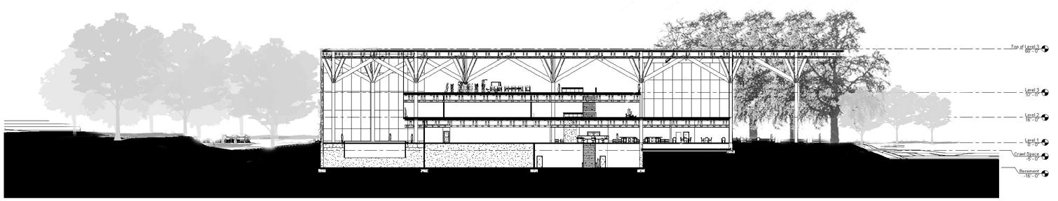 Conceptual Technique: Emphasized tree-like structural elements to blend into the surrounding, ‘created’ greanspace(s)