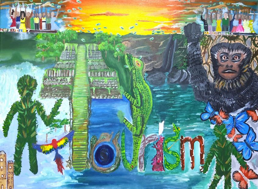 I have always been passionate about preserving and protecting the environment Despite some believing that doing so will result in less financial gain My art expresses that we can do both in Belize protect the environment while benefitting our economy My art showcases people throwing money in the air, those people represent the people of Belize. As they throw the money, you may watch it fall into the word 'Tourism' situated around Belize's Maya site, fauna, caves, Great Blue Hole, sustainable resorts, and everything else that brings tourists to our gem. The money that is falling represents a green investment into sustainable things in tourism and our economy. Also, the people are standing on the SDG meaning this investment all contributes to sustainable development. Finally, there is an individual who resembles leaves. You can see these men holding and putting the word "tourism" together to illustrate that the environment is at the heart of ‘tourism in Belize’ and the environment and sustainability are the keys to growing tourism in Belize