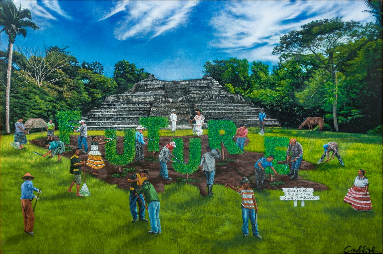 In this captivating acrylic painting, titled "National Garden of Tourism: Growing the Future," a compelling narrative unfolds This artwork masterfully portrays the convergence of cultural diversity and unity, shaping the path forward for Belize's tourism. The backdrop of the iconic Maya temple, Caracol, sets the stage. Belize's diverse cultural tapestry takes on the roles of gardeners and landscapers, combining their talents to craft a lush garden mirroring the map of Belize. From each district, vibrant and meticulously groomed hedges emerge, collectively spelling out the word "FUTURE." This symbolic representation underscores the shared responsibility of all Belizeans to safeguard our natural resources and enhance our appeal as a tourist paradise. The painting is a harmonious celebration of both culture and nature, showcasing how unity amid diversity serves as the fundamental formula for growth within the tourism industry. It's a testament to Belize's potential to flourish by embracing its rich heritage and the beauty of its environment.