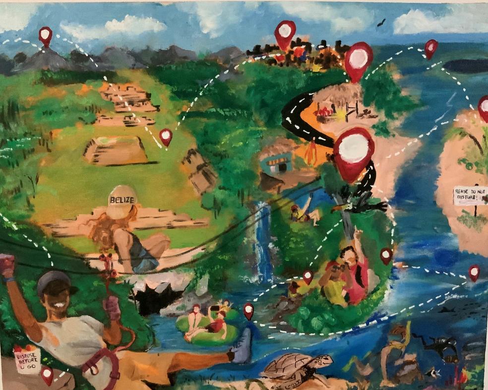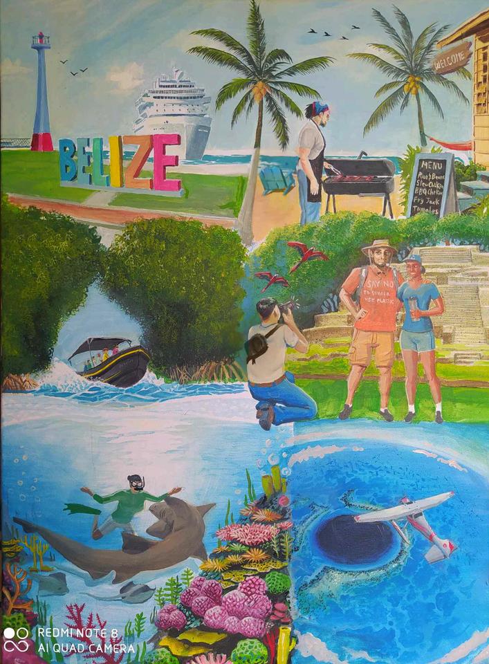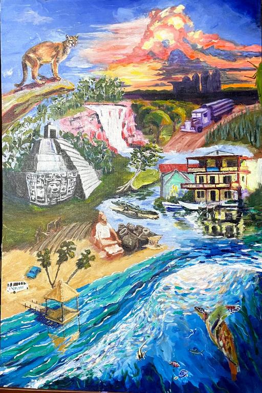 This painting depicts a dreamlike vision of the many adventures one can have in Belize as a tourist. Land, sea, air, underwater, island, on the coast, and deep within the heart of the country, anywhere you go there is something awesome waiting for you Rather than showing one single environment, many different places or “dreams” are shown which transition into one another to form a combined vision. Each dream is meant to represent a different aspect of tourism (adventure, culture, culinary, wildlife, sustainability, etc.) and highlight the concept of “traveling” itself. The painting features tourist destinations, plants, and animals, that tourists may encounter, such as the Maya sites, mangroves, coconut trees, nurse sharks, sting rays, and scarlet macaw It also shows various modes of travel that are commonly used to go from destination to destination