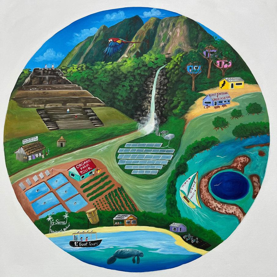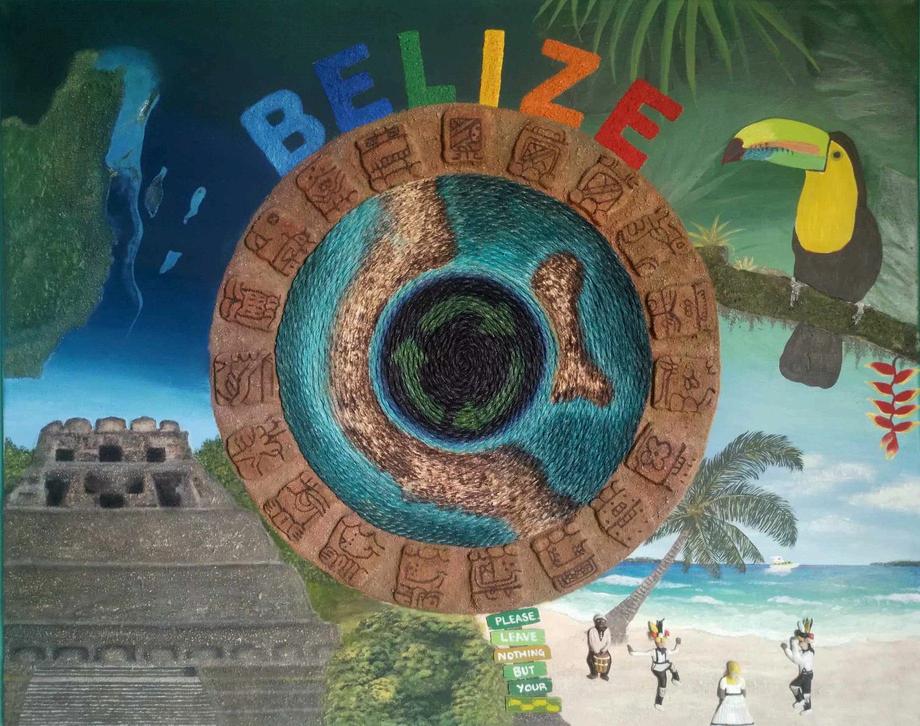 Sustainable tourism focuses on highlighting all the positive attributes that the country has to offer Sustainable development depends on Reduce, Reuse, and Recycle which is the foundation of my mixed media art which has the reuse symbol at the center of the famous Blue Hole. Advocating for the protection of marine life. The Blue Hole is painted on an eco-friendly jute fiber rope intricately sewn to the attached. It is bordered by a three-dimensional Maya calendar and our famous Xunantunich Maya temple which depicts rich culture and history. While we strive to protect our natural habitat and conserve our wildlife, tourists get to bask in the sunshine while getting the chance to experience our unique cultures such as the Garifuna and Jankunu dance.