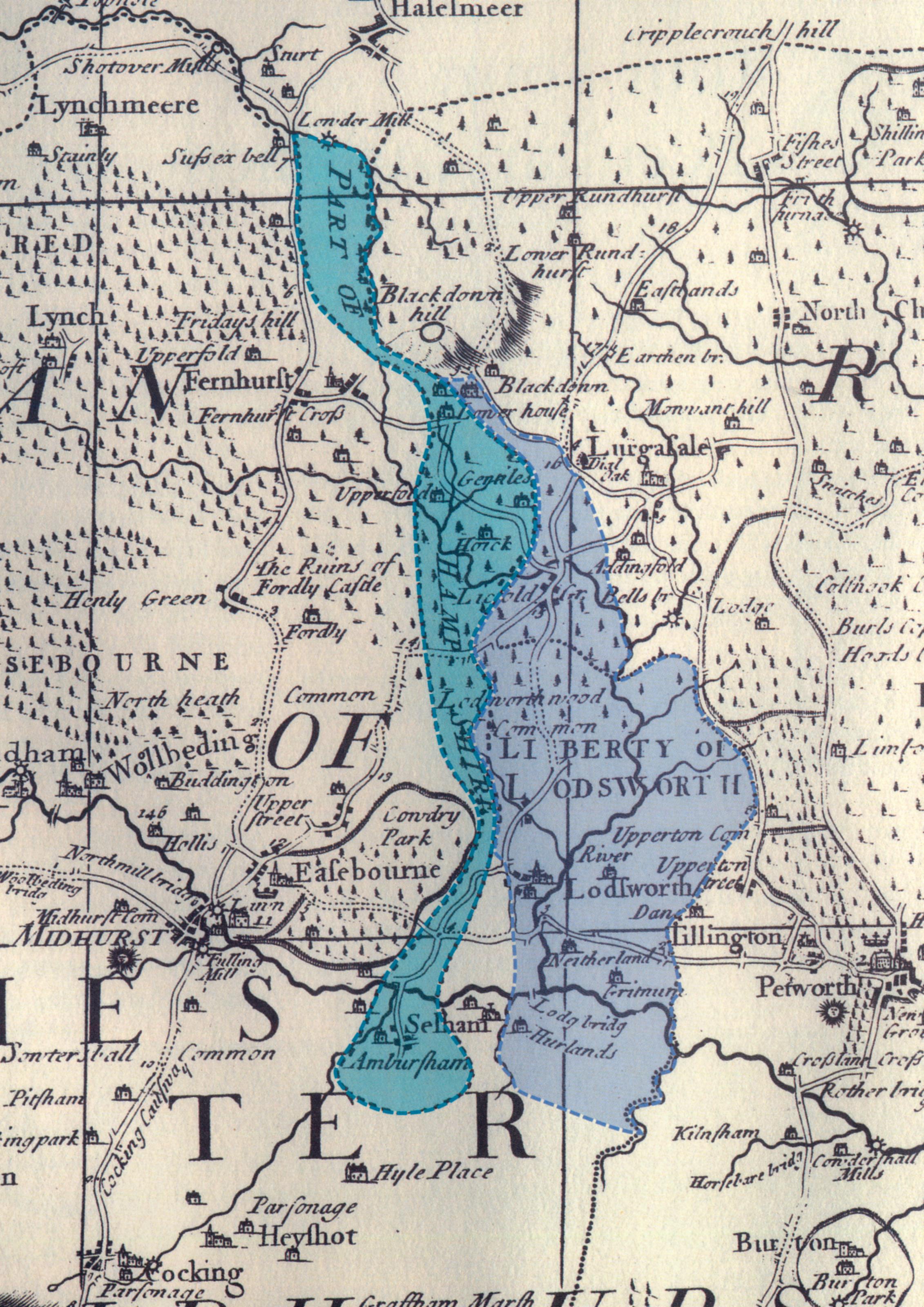 Another exempt jurisdiction is shown on the map immediately to the east of Sussex’s Hampshire. The Liberty of Lodsworth refers to the freedoms enjoyed by the bishops of London who once owned the manor here since the early twelfth century. These bishops enjoyed considerable power within their Liberty, free from any authority of the Sheriff of Sussex, the Chamberlain of the King’s Household, the Earl Marshal of England and the bishops of Chichester. They held their own courts at the Manor House, with its own court room and dungeon (the stone building just south of the church), with power to imprison and even execute. Capital offenders were hanged at Gallows Hill (pinpointed on the OS Explorer map of the area), an isolated spot on the edge of Graffham Common.