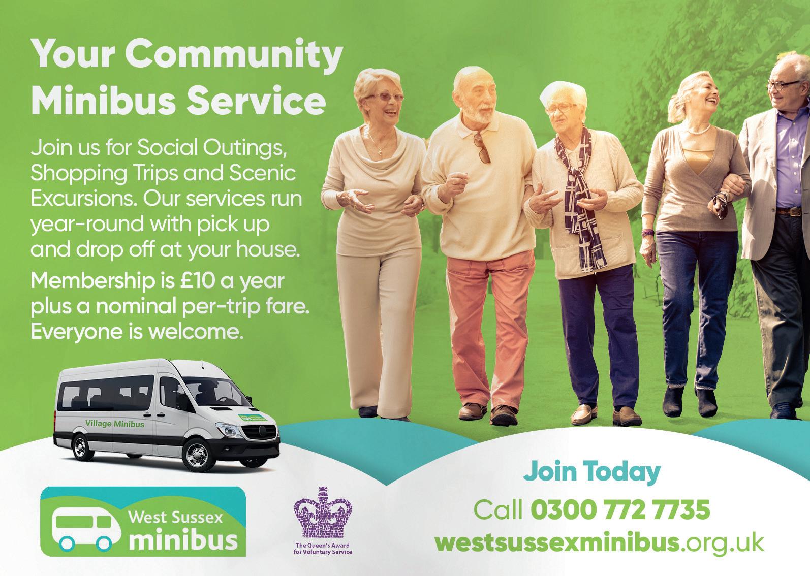 West Sussex Minibus, Five Villages, organises practical shopping trips to Bognor Regis weekly and Chichester monthly, plus social excursions in spring, summer and autumn. This year they include a Cream Tea Cruise on the Chichester Canal, Scenic Drives to the seaside at Felpham and the riverside café, Amberley, with time for a relaxing lunch. In addition, Garden Centre visits to Pulborough, Angmering (Haskins) and Worthing (Highdown).