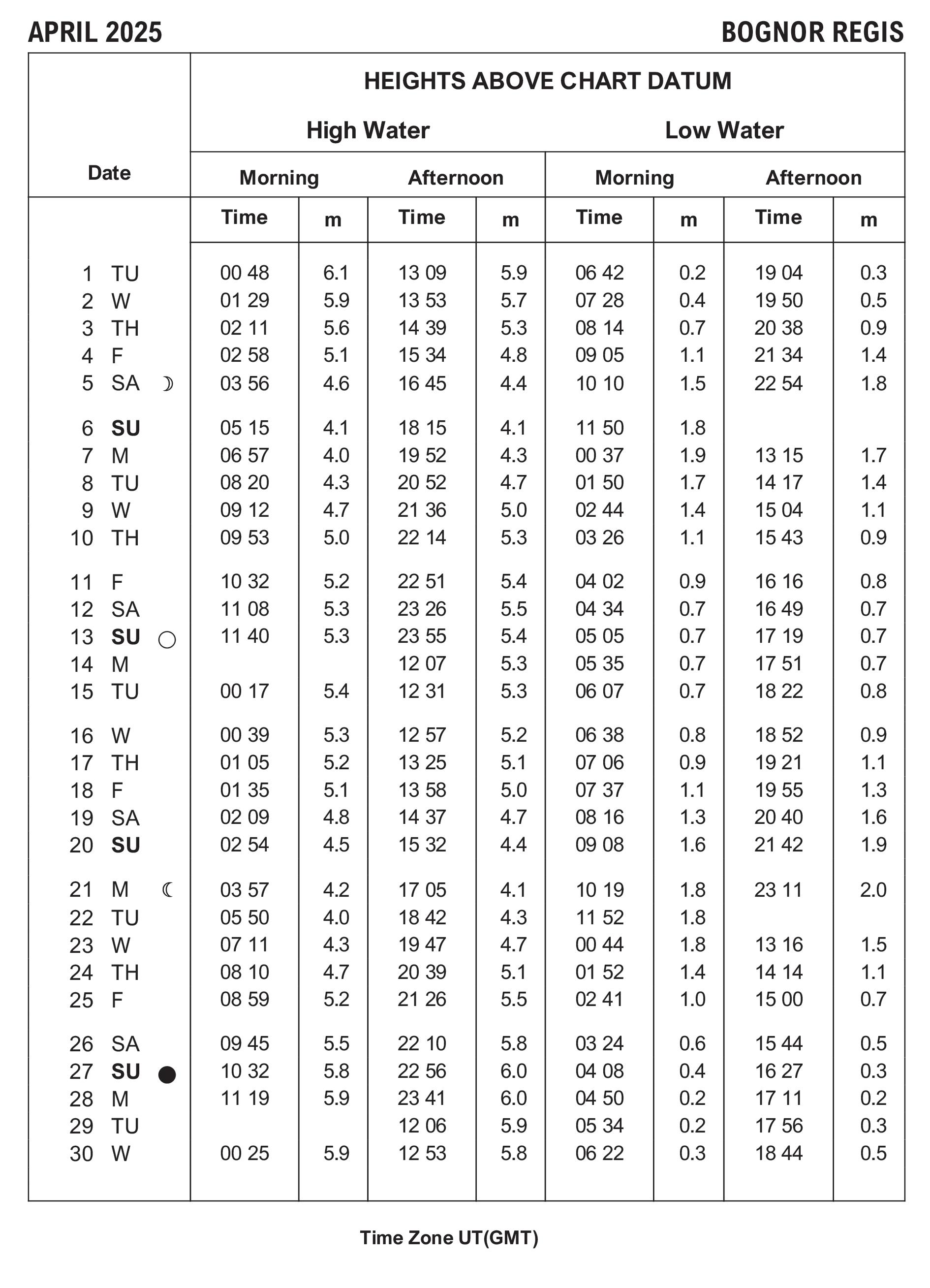 BOGNOR REGIS TIDE TABLE