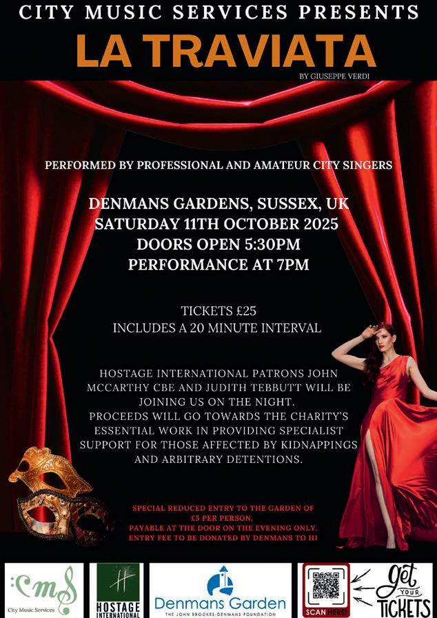Join us for a spectacular performance of Verdi’s timeless opera, La Traviata performed by City Music Services. Immerse yourself in the tragic love story of Violetta and Alfredo beautifully sung by amateur and professional singers in the stunning surroundings of Denmans Garden and Midpines Cafe. Proceeds from ticket sales and a raffle featuring luxurious prizes donated by local businesses will go to support Hostage International, a charity founded by Sir Terry Waite and which provides specialist support for those affected by kidnappings and arbitrary detentions. The charity’s patrons Jude Tebbutt and John McCarthy CBE , both former hostages, will be joining us to kick off the evening.