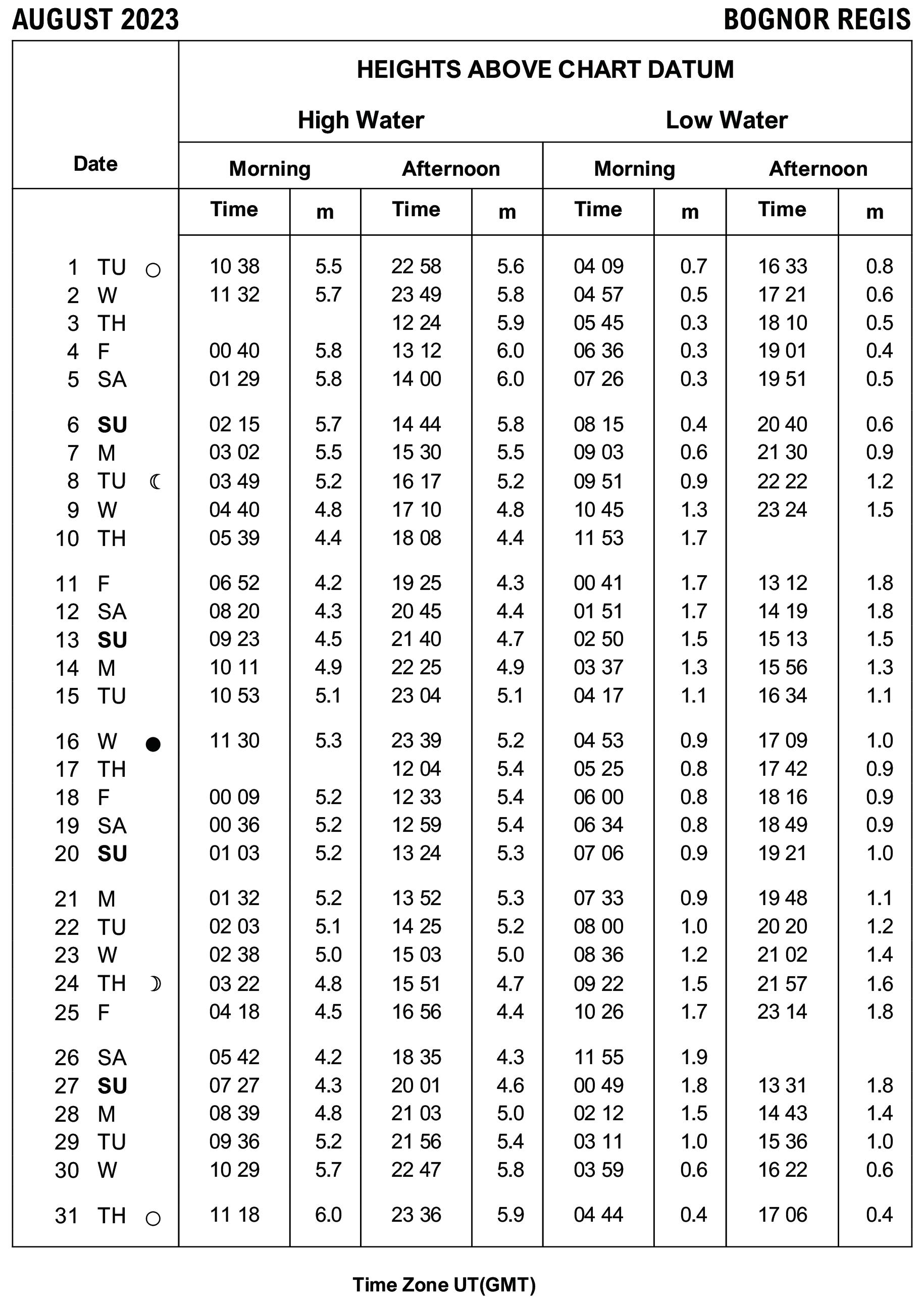 To contact VILLAGES IN FOCUS please email: office@infocusmagazines.co.uk 44 Villages in Focus Tidal information is reproduced by kind permission of the Controller of Her Majesty’s Stationery Office and the UK Hydrographic Office. Crown Copyright. All Rights reserved. BOGNOR REGIS TIDE TABLE August 2023, Time Zone GMT