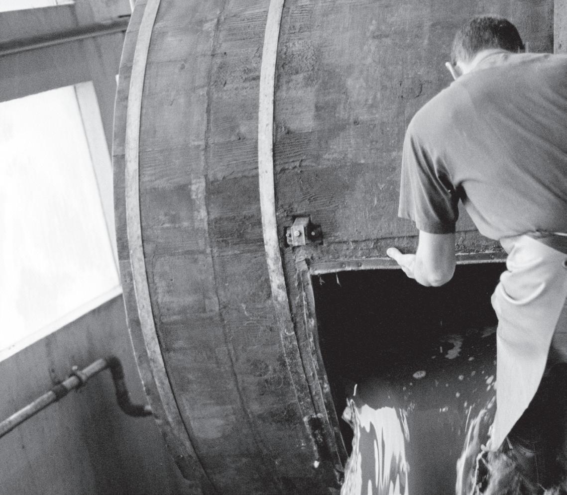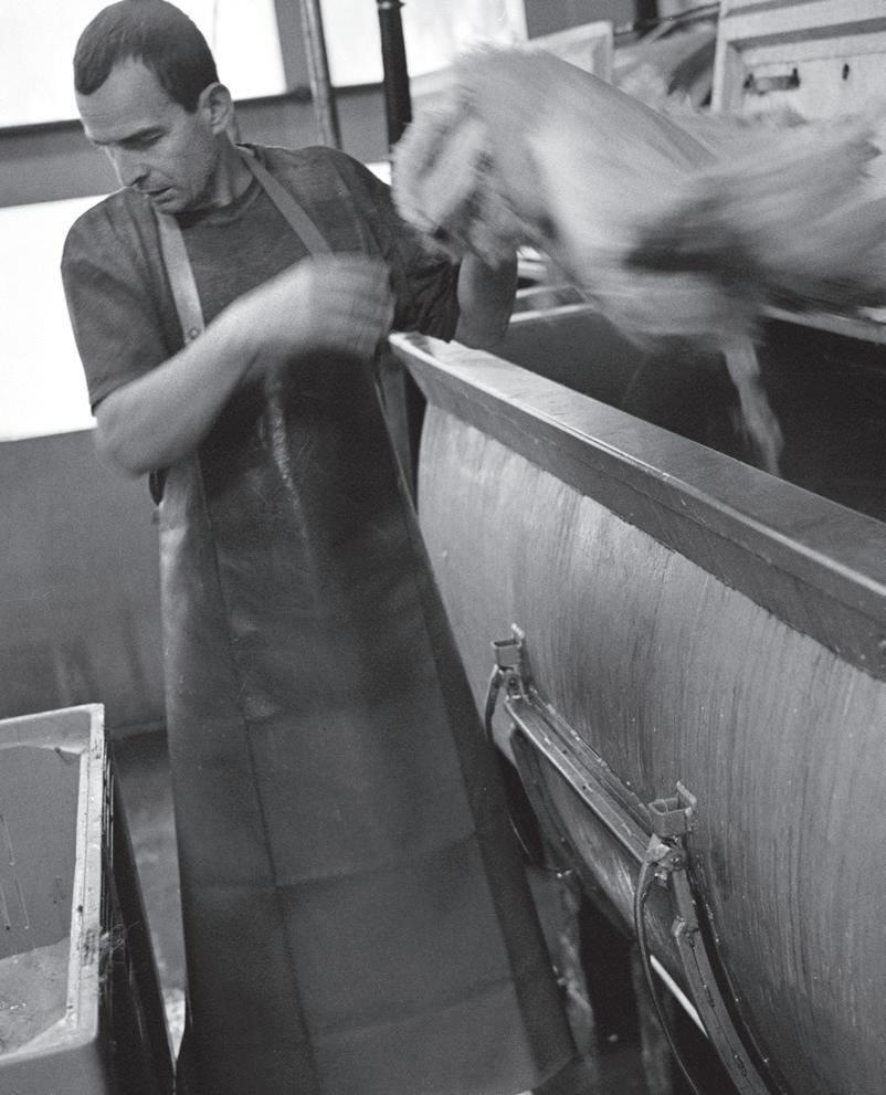 Unter den Maschinen in der Zurichterei ist die moderne Reinigungsmaschine sozusagen der «Rolls Royce». In ihr werden die Haut- und Wollfette entfernt. Das Resultat: Das Leder bleibt schön weich, und die Wolle verliert ihren Tiergeruch.