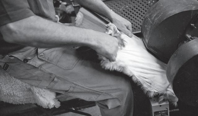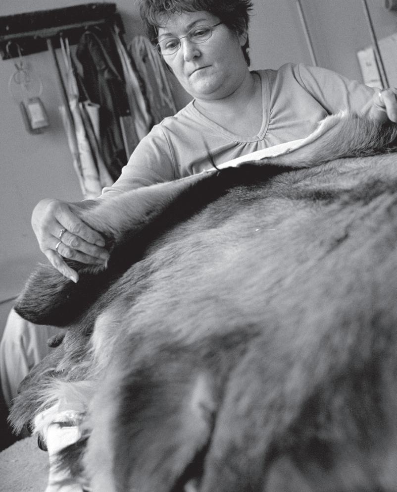 Vor allem Lamm- und Schaffelle weisen an ihren Rändern Rückstände von Schleifstaub auf, der ausgekratzt werden muss. Zugleich werden die Ränder von Hand gekämmt – denn sie sind zuvor von der Kämmmaschine nicht erreicht worden. Bei der Endkontrolle erhalten die Felle den letzten Schliff: Einige werden hier genäht oder mit präzisen Zuschnitten in ihre perfekte Form gebracht.