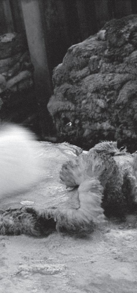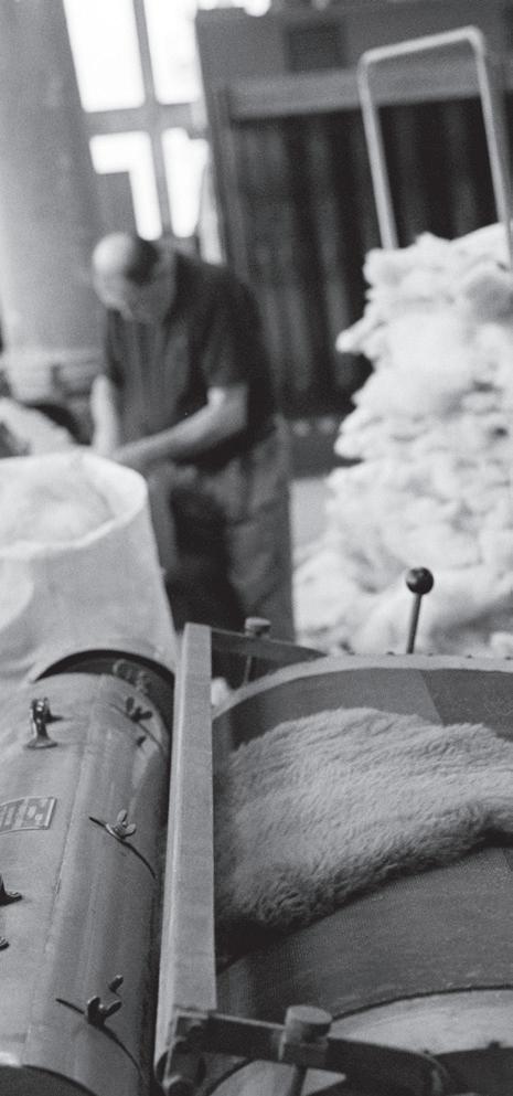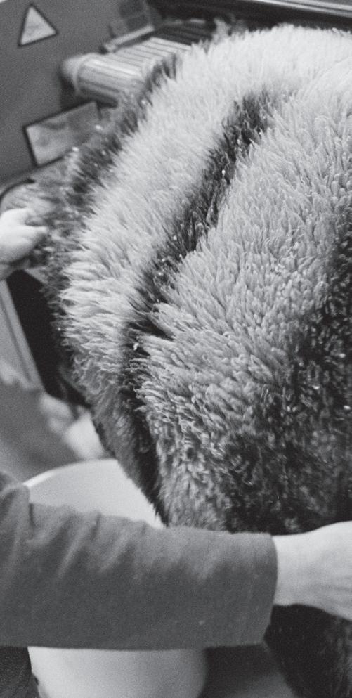 Was einfach aussieht, ist ziemlich anstrengend: Die Arbeit an der Kämmmaschine erfordert einen beträchtlichen Krafteinsatz. Hier wird die Wolle «geöffnet» – sie erhält dabei mehr Volumen und das Fell sieht optisch schöner aus. Darüber hinaus entfernt die Maschine überstellige Wolle. Diese wird abgesaugt, gesammelt und weiterverwendet, zum Beispiel als Stopfmaterial.
