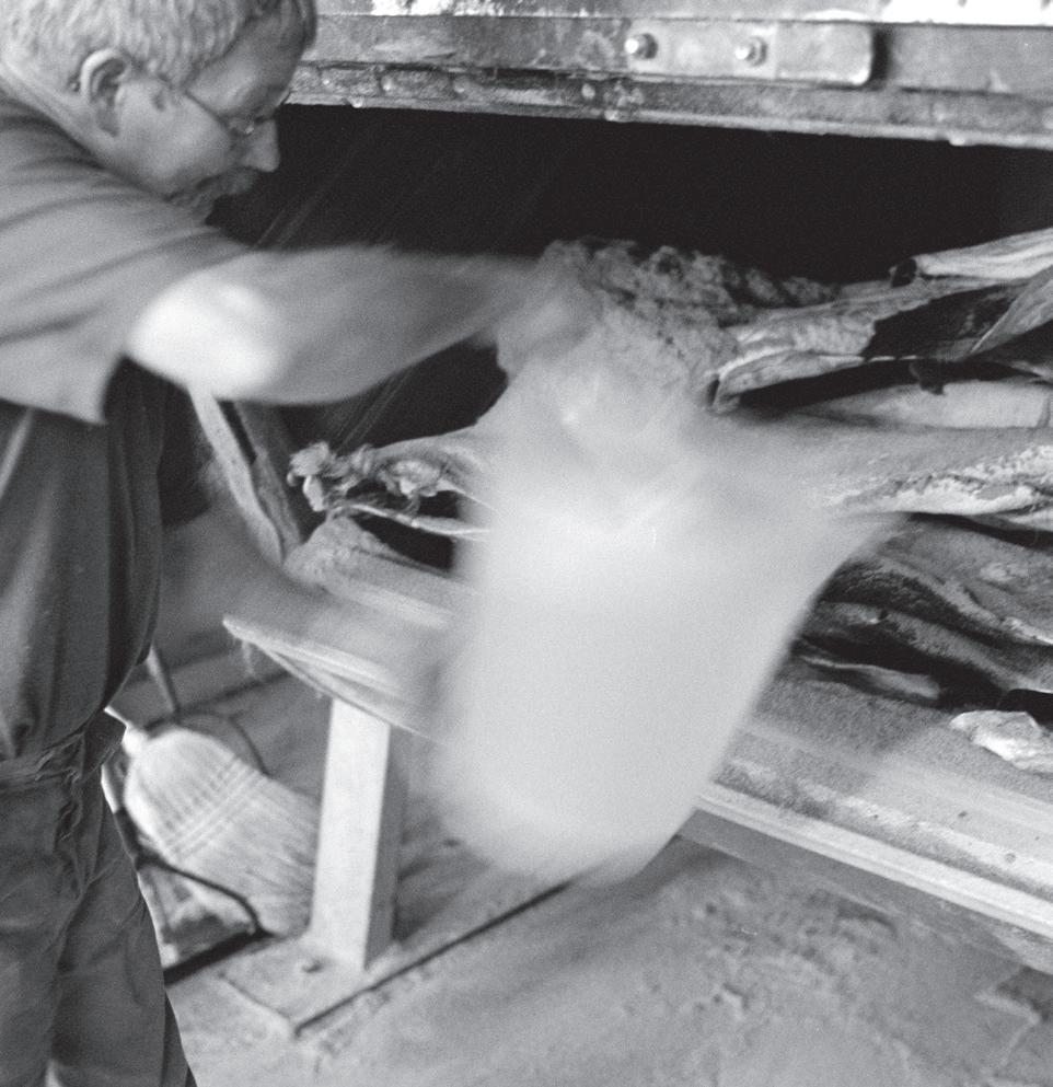 Kein Wunder sind die Felle etwas zerknittert. Das Stollen bringt sie wieder in Form. In feuchtem Zustand werden sie auseinandergezogen. So finden sie wieder zu ihrer Weichheit und zu ihrer ursprünglichen Grösse zurück.