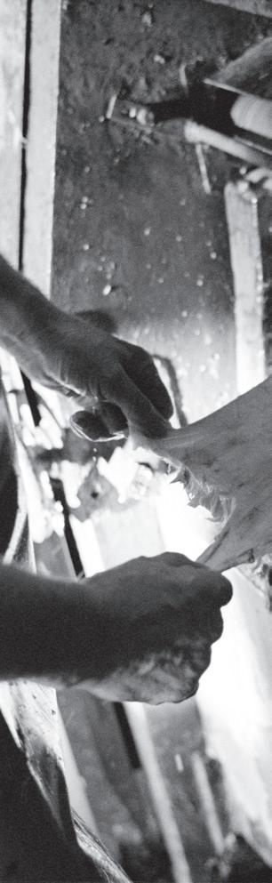 Die rohen Felle werden von gröberen Fett- und Fleischrückständen befreit und an ihren Rändern in Form gebracht.