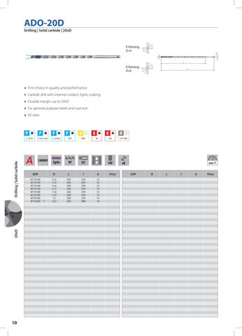 First choice in quality and performance Carbide drill with internal coolant, EgiAs coating Double margin, up to 20xD For general purpose steels and cast iron 92 sizes