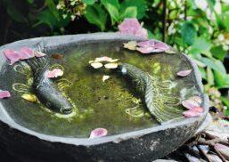 30 Vogeltränke ‘Fisch’ ausNatursteinfindlingen, Steinmetzarbeit,øca. 45cm €118,– Art. 153191