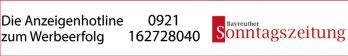 NAMASTE AUCH BEI LIEFERANDO Bayreuther Pizza-Service Erlanger Str. 33 •95444 Bayreuth Dauerangebot: 1x Familienpizza inkl.1 gr.gem. Salat, 1Ltr.Cola (45 x32cmbis zu 5Auflagen) nur 26,90 € Wochenend-Angebot (Jeden Samstag und Sonntag) Partypizza (60x40 cm) inkl.1 gr.gem. Salat nur 29,90 € Öffnungszeiten: So.-Do.16:30-22:30 &Fr.-Sa. 16:30-24:00 Uhr 81111 0921 Bester Pizza-Service Bayreuth 2010 von10 bewertetenlaut Uni Bayreuth Bester Pizza-Service Bayreuth 2019 von10bewertetenlaut Bayreuth Blatt / Vespa Club FREIER EINTRITT FÜR EVENT AM 05.05.23 info@rollo-raab.de ·www.rollo-raab.de E 50 Jahre 95517 Emtmannsberg Dorfstraße 11,Tel. 09209/989-0 95692 Konnersreuth Tel. 09632/923100 Besuchen Sie unsere 95517 Emtmannsberg Dorfstraße 11 Tel. 09209/989-0 BAYREUTH Wir für Ihre Immobilie. Persönlich &kompetent. arnoldundvogt.de VERKAUF BEWERTUNG VERMIETUNG IHR BEWÄHRTES DUO Wir sind weiterhin für Sie da. Sophienstraße 22 95444 Bayreuth Tel. 0921/7867250 www.doetzers.de ße Diesen Sonntag im Restaurant und to go : ZarteLammkeule, fränk. Sauerbraten, frischer Spargel aus Franken, Gansbrust,Rehbraten, Roulade Sowie unsere¼Dötzer Ente mit 2Bth. Klößen nur 12 € 20. Mai2023 18:30 Uhr Tour de Weingut -unserefränkische Weinreise Frankens Spitzenweine mitTop-Niveau verbunden mit einem