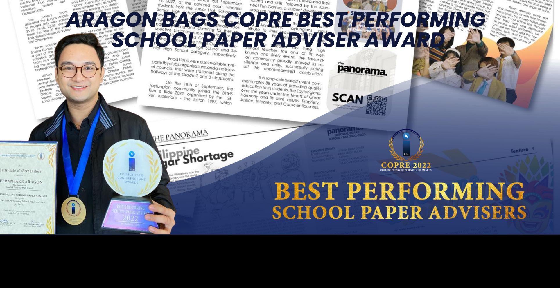 The Panorama’s club adviser, Mr. Jeffran Jake Aragon was awarded as one of the “Best Performing School Paper Advisers in the Region” by the COPRE 2022 and Philippine Information Agency Region IV in Iloilo City.
