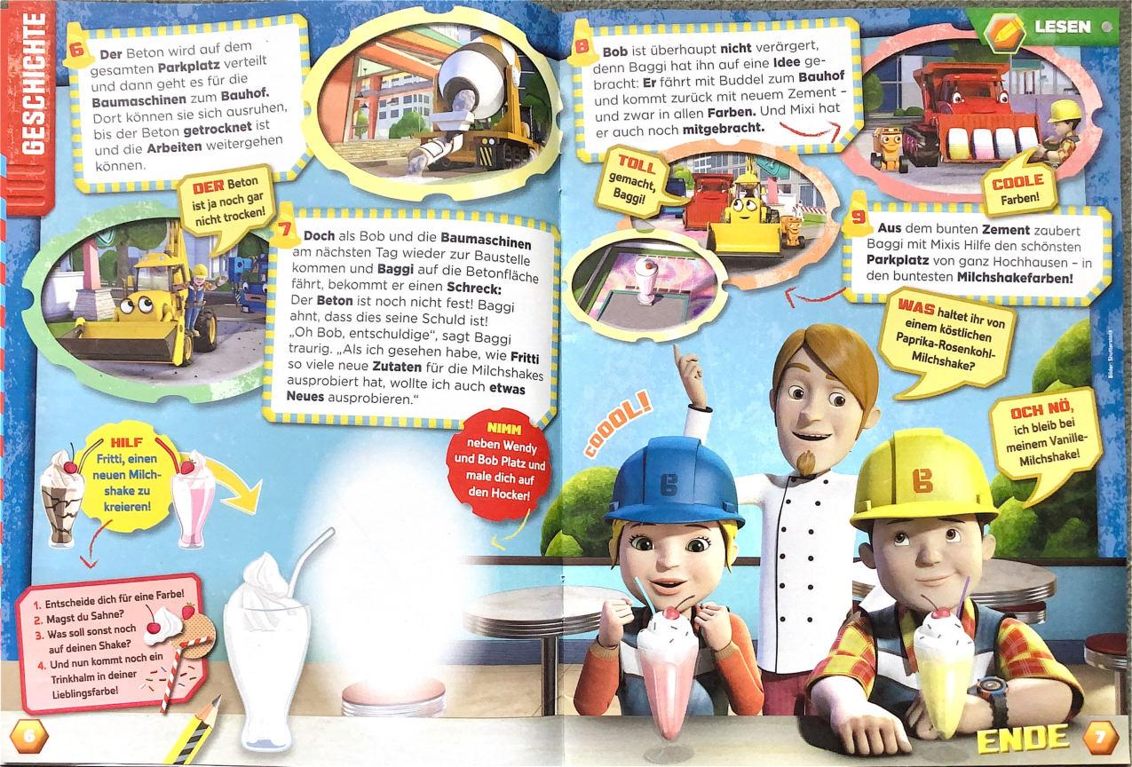 amnächsten Tagwieder zur Baustelle Parkplatz von ganz Hochhausen - in kommenund Baggi auf die Betonflāche den buntesten Milchshakefarben ! fährt, bekommt er einen Schreck: Der Beton ist noch nicht fest! Baggi WAShaltetihrvon ahnt, dass dies seine Schuld ist! einemköstlichen „Oh Bob, entschuldige", sagt Baggi prika-Rosenkohl- traurig, „Alsich gesehen habe, wieFritti Miichshake? so viele neue Zutaten für die Milchshakes ausprobiert hat, wollte ich auch etwas Neues ausprobieren."
