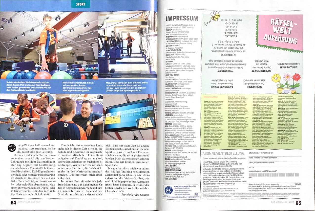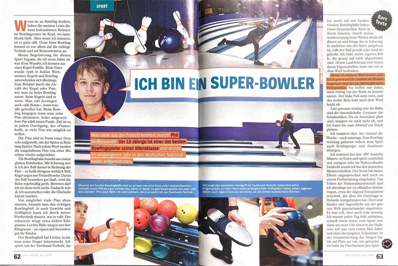 192,9 Pins geschafft – man kann Damit ich dort mitmachen kann, nicht, dass mir kaum Zeit für andere maximal 300 erreichen. Ich fin- gehe ich in dieser Zeit nicht in die Sachen bleibt. Das Sch de, das ist eine gute Leistung.Schule und bekomme im Gegensatz Sport ist, dass ich auch mit Freund : ABONNEMENTBESTELLUNGBme iedem Seiben Um mich auf solche Turniere vor- zu meinen Mitschülern keine Haus- spielen kann, die nicht profes habe ich alle paar Wochen aufgaben auf. Das klingt erst mal toll, bowlen. Mein Vater reserviert uns ein Lehrgänge mit dem Nationalkader aber eigentlich mussich mich doppelt Bahn, und wir können zusammen Der Tag beginnt mit Lauftraining,anstrengen. Würden sich meine Schul- Spaß haben. aben Wir Theorie-Einheiten zunoten verschlechtern, dürfte ich nicht Ich glaube, dasS mich vor allem Wurf-Techniken, Roll-Eigenschaften mehr in der Nationalmannschaftdas häufige Training weiterbringt. Bälle oder richtiger Positionierung.spielen. Das motiviert mich dran- Manchmal gucke ich mir auch Erklä Anschluss trainieren wir auf derzubleiber ideos an oder Videos darüber, wie Bahn. Zum Beispiel, um besser zu ste- meiner Freizeit stehe ich jede mein Lieblingsspieler aus Australi der mehr Pins abzuräumen. Man freie Minute auf der Bahn meines Va- spielt: Jason Belmon spielt entweder alein, im Doppel oderters in Remscheid und arbeite mit ihm besten Bowler der Welt. Das möchte in Dreier-Teams. Es finden auch rich- an meiner Technik.Ich habe wirklichich auch schaffen Spaß daran, deshalb stört es mich Prot 6434Dein SPIEGEl 05| 2024