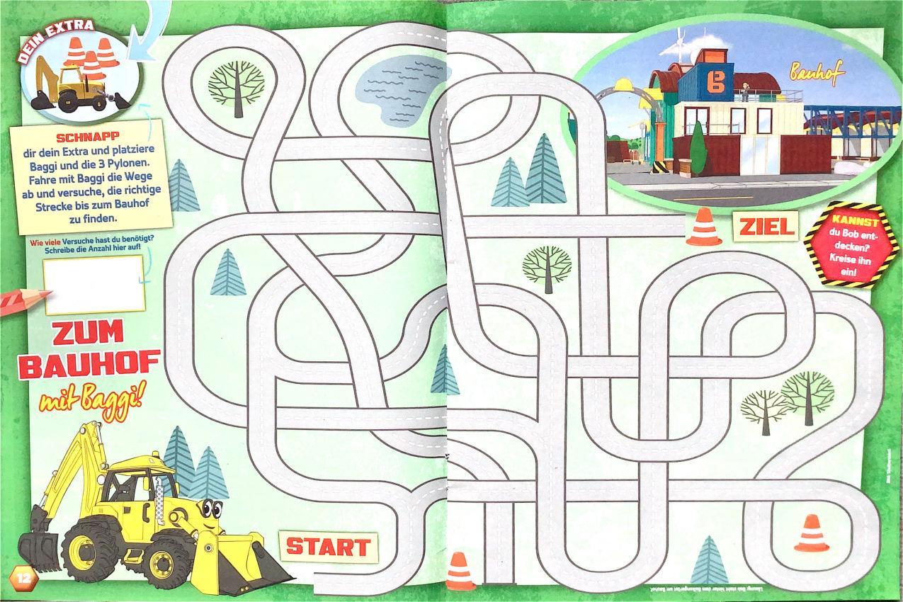 SCHNAPP dir dein Extra und platziere Baggi und die 3Pylonen. Fahre mit Baggi die Wege ab und versuche, die richtige Strecke bis zum Bauhof zu finden.