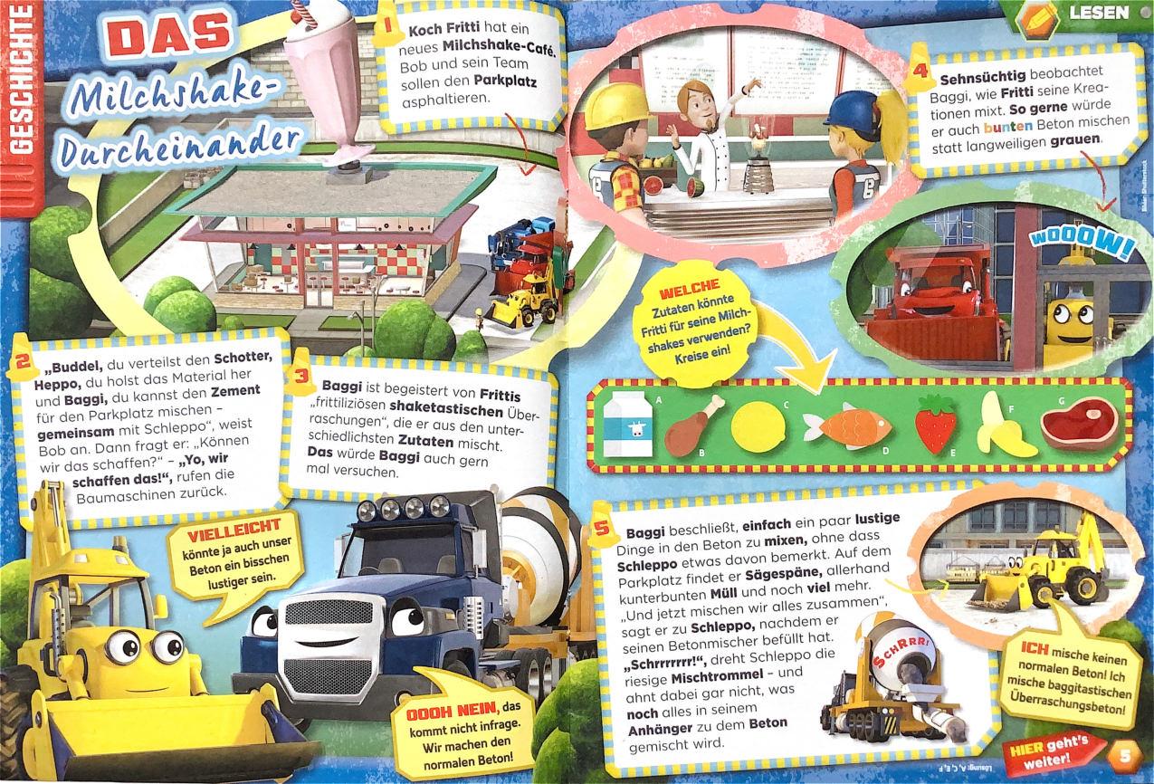 „Buddel, du verteilst den Schotter, Heppo, du holst das Material her Baggi ist begeistert von Frittis undBaggi, dukannst den Zement „frittiliziösen shaketastischen Über- für den Parkplatz mischen raschungen“, die er aus den unter- gemeinsam mit Schleppo“, weist schiedlichsten Zutaten mischt. Bob an. Dann fragt er.„Können Das würde Baggi auch gern ir das schaffen?“ – „Yo,wir mal versuchen. schaffen das!“,rufen die Baumaschinen zurück.
