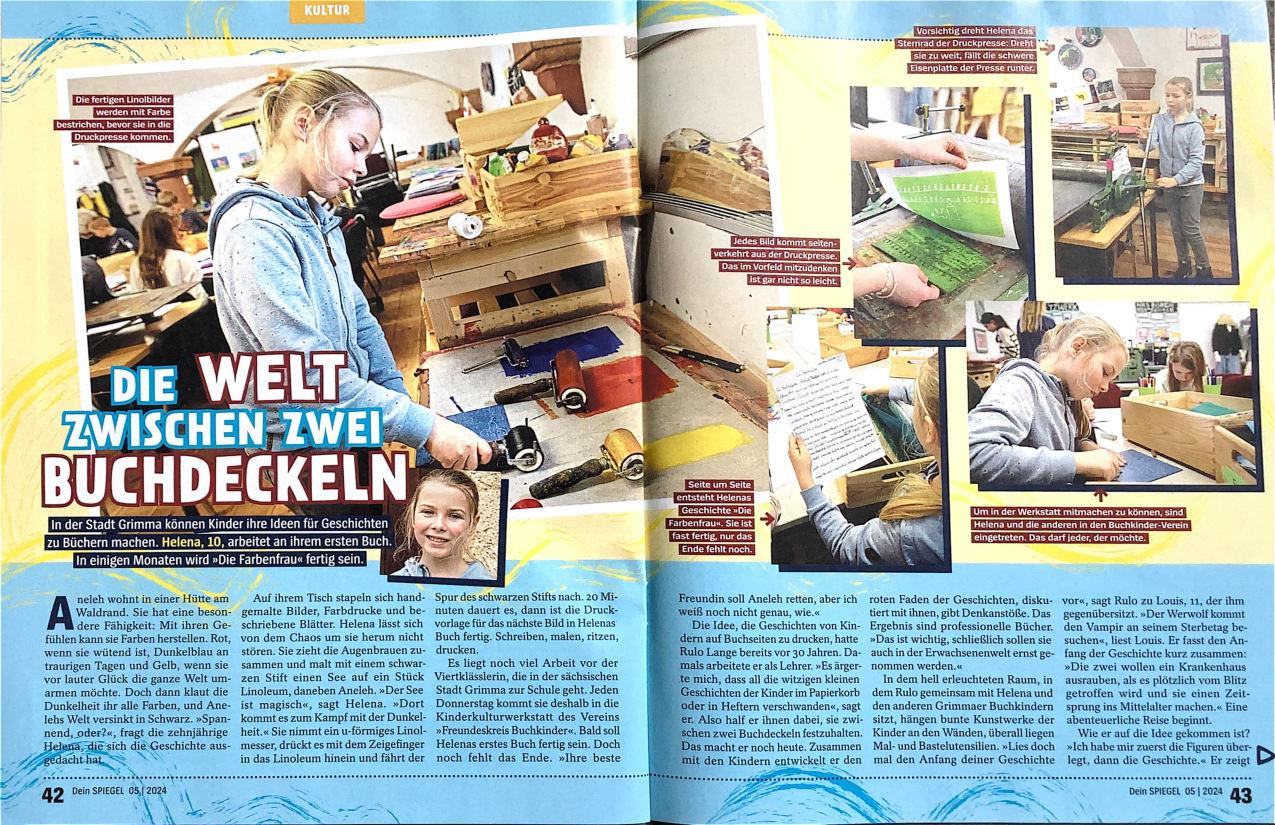 Freundin soll Aneleh retten, aber ich roten Faden der Geschichten, disku- vor«, sagt Rulo zu Louis, 11, der ihm Waldrand. Sie hat eine beson- gemalte Bilder, Farbdrucke und be- nuten dauert es, dann ist o edhniatesaienve Kr Eptoiš maptDskneieB D viahmpr sDersaökag t tiert mit ihnen, gibt Denkanstöße. Das gegenübersitzt. »Der Werwolf kor dere Fähigkeit: Mit ihren Ge- schriebene Blätter. Helena lässt sich vorlage für das nächste Bildin Helenas wenn sie wütend ist, Dunkelblau anstören. Sie zieht die Augenbrauen zu- drucke Rulo Lange bereits vor 30 Jahren. Da- auchin der Erwachsenenwelt ernst ge- fang der Geschichte kurz zusammen:= traurigen Tagen und Gelb, wenn siesammen und malt mit einem schwar-Es liegt noch viel Arbeit vor der rete er als Lehrer. »Es ärger- nommen werder 1 d 1- 111 1II ▇ 11LtU lauter Glück die ganze Welt um- zen Stift einen See auf ein Stück Viertklässlerin, die in der sächsischen te mich, dass all die witzigen klei In dem hell erleuchteten Raum, inausrauben, als es plötzlich vom Blit ochte. Doch dann klaut die Linoleum, daneben Aneleh. »Der SeeStadt Grimma zur Schule geht. Jeder Geschichten der Kinder im Papierkorb dem Rulo gemeinsam mit Helena und getroffen wird und sie einen Zet Dunkelheit ihr alle Farben, und Ane- ist magisch«, sagt Helena. »DortDonnerstag kommt sie deshalb in oder in Heftern verschwanden«, sagtden anderen Grimmaer Buchkindern sprung ins Mittelalter machen.« Ein lehs Welt versinkt in Schwarz, »Span- kommt es zum Kampf mit der Dunkel- Kinderkulturwerkstatt des Ver er. Also half er ihnen dabei, sie zwi- sitzt, hängen bunte Kunstwerke derabenteuerliche Reise begin d, oder2«, fragt die zehnjährige heit, « Sie nimmt ein u-förmiges Linol- »Freundeskreis Buchkinder «, Bald soll zwei Buchdeckeln festzuhalten. Kinder an den Wänden, überall liegenWie er auf die Idee geko Helena, die sich die Geschichte aus- messer, drückt es mit dem Zeigefinger Helenas erstes Buch fertig sein. Doch Dasmachtersochheute.Zusaummen Mal-undBasteiutenilien. Liesdoch schhabe nitzuerstdieFegueniber D in das Linoleum hinein und fährt der noch fehlt das Ende. »Ihre beste den Kindern entwickelt er denmal den Anfang deiner Geschichtelegt, dann die Geschichte, « Er zeigt