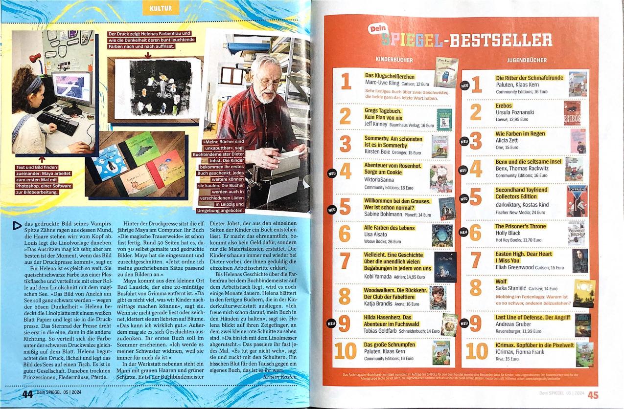 D das gedruckte Bild seines Vampin Hinter der Druckpresse sitzt die elf- Dieter Johst, der aus den einzelnen 6 The Priso 6 Alle Farben des Lebens hne ragen aus dessen Mund, jährige Maya am Computer. Ihr BuchSeiten der Kinder ein Buch entsteher Holly Black Sa Aisato die Haare stehen wirr vom Kopf ab.»Die magische Trauerweide« ist schonlässt. Er macht das ehrenamtlicl Hot Woow Books; 26 Euro uis legt die Linolvorlage daneben. fast fertig. Rund 50 Seiten hat es, da- kommt also kein Geld dafür, sondern 7 Easton High. Dear Heart besten ist der Moment, wenn das BildBilder. Maya hat sie eingescannt undKinder schauen immer mal wieder bei 7