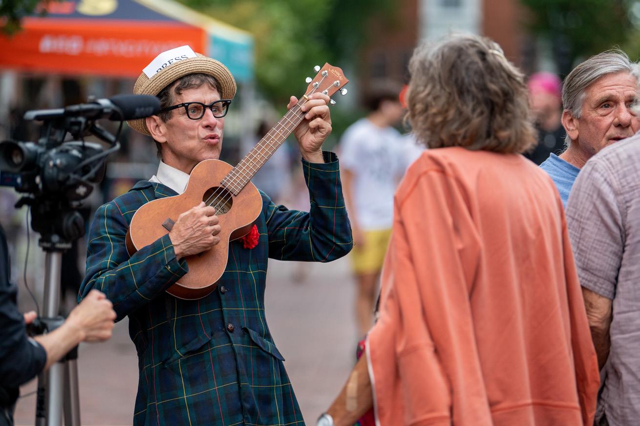 At the Leunig’s and AARP pitches, performances are scheduled on the hour; at the von Trapp Brewing and Community Bank pitches, performances are on the half-hour. Exact performance schedules are available at the info both as well as on the BCA Events app and vtfools.org (beginning July 31). Shows that happen only once or twice are listed in the Schedule at-a-Glance in this guide.