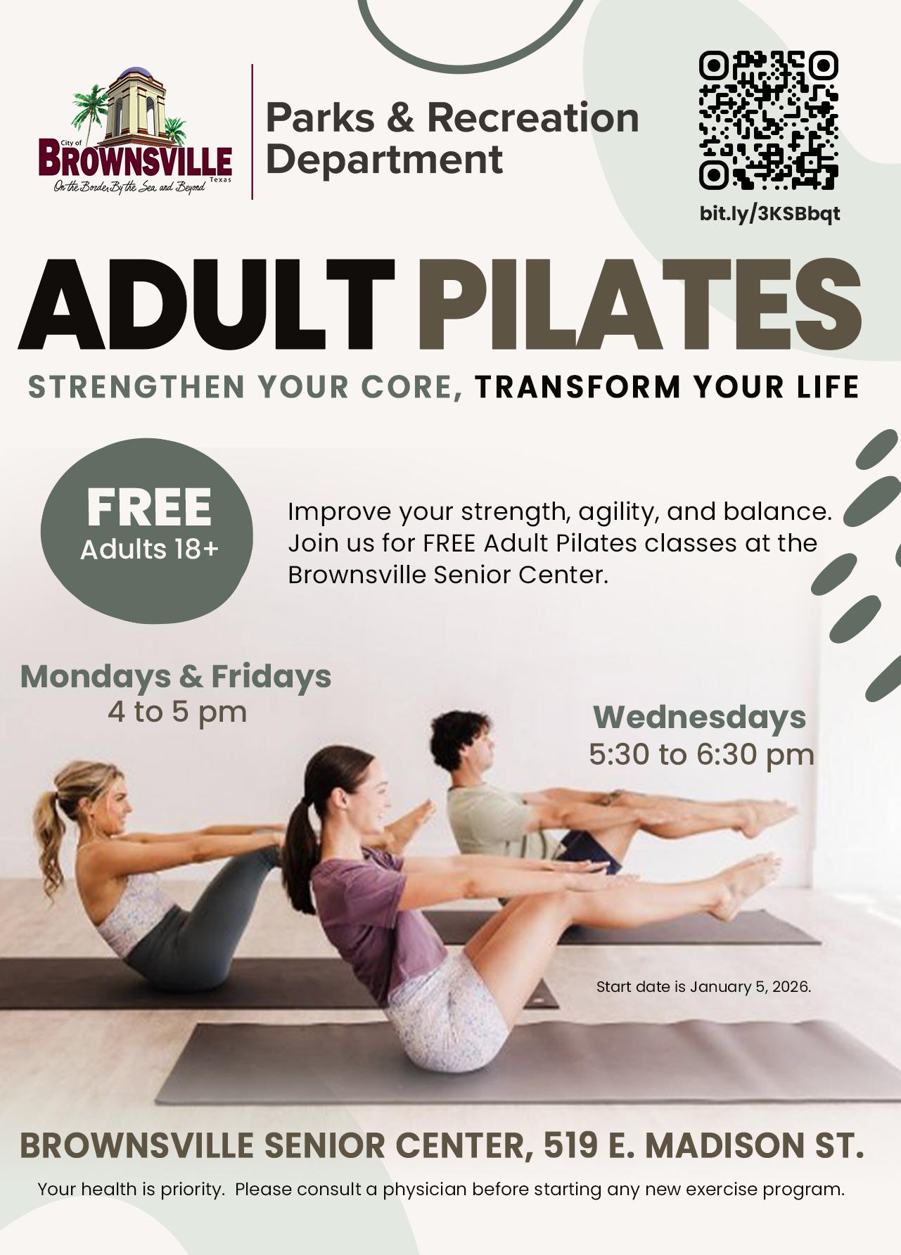 Strengthen Your Core & Find Your Balance! Our bi-weekly Pilates class is a rejuvenating and effective way to improve your flexibility, build lean muscle strength, and enhance your mind-body connection. All fitness levels welcome.