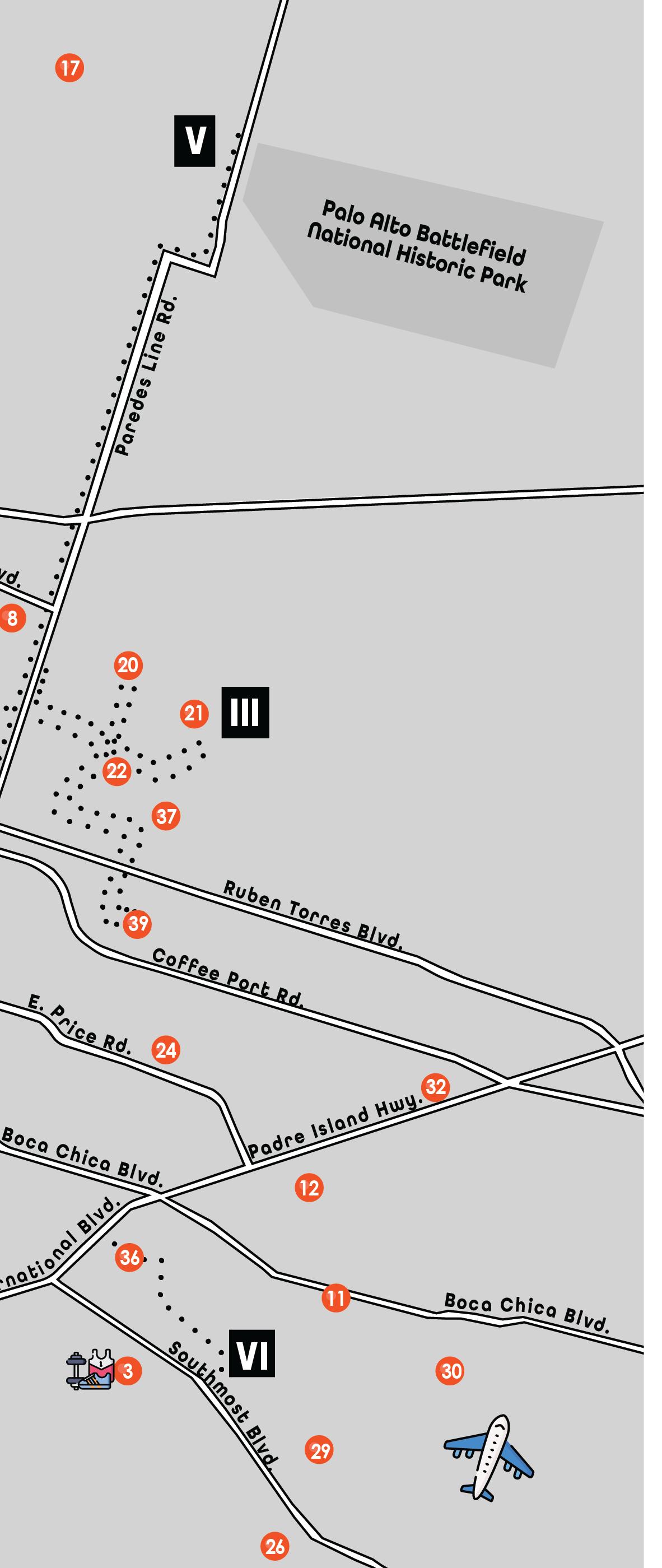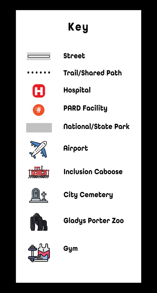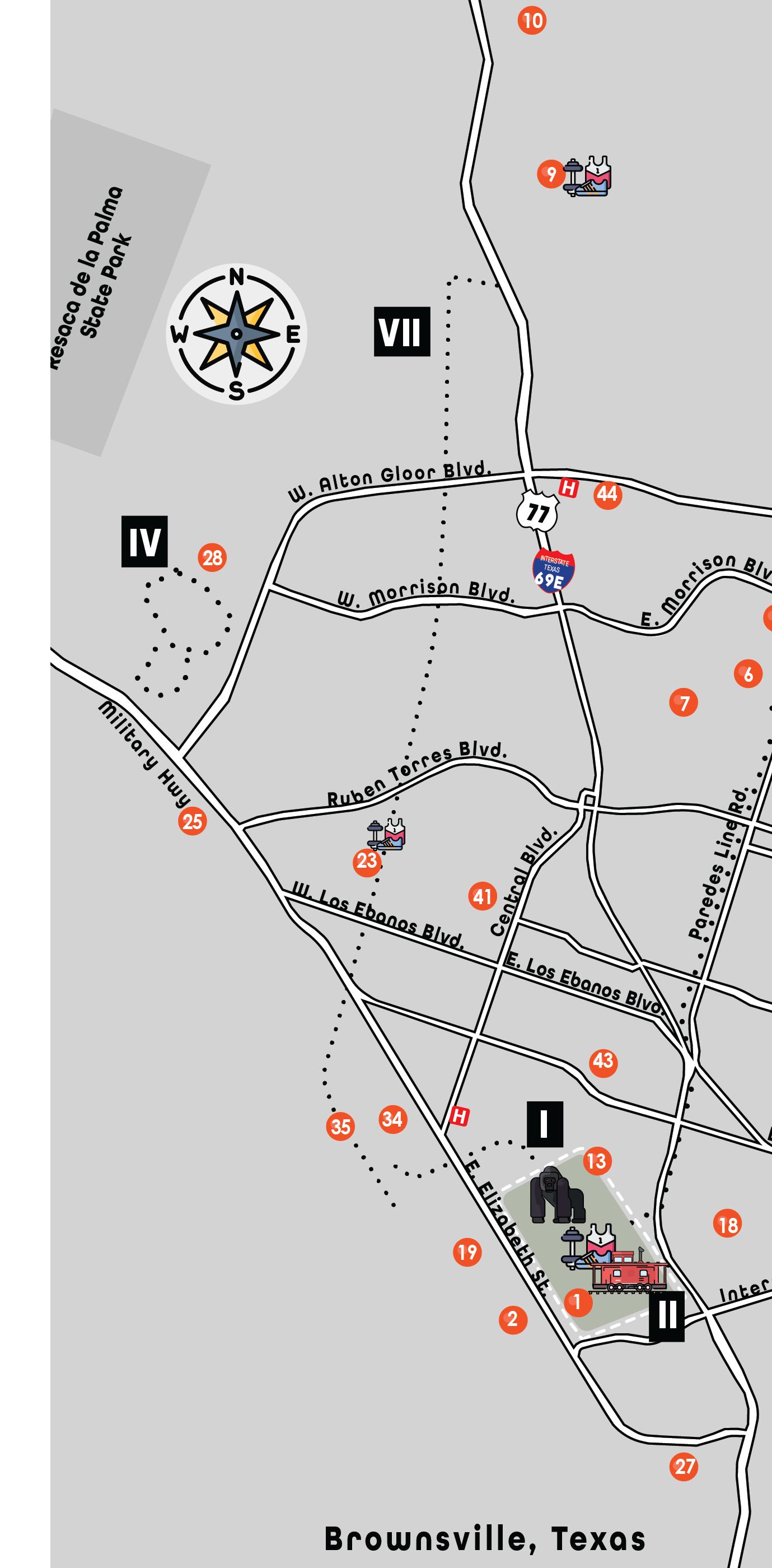 (B) – Brownsville Sports Park (C) – Cabler Park (D) – Dean Porter Park (E) – Brownsville Events Center (F) – Monte Bella Trails Park (L) – Linear Park (M) Morningside Park (U) – Gonzalez/Urban Center (O) – Oliveira (P) – Lincoln Park (R) – Downtown Rec Center (S) – Old City Cemetery (T) – Trail of Texas Trees Park (W) – Washington Park
