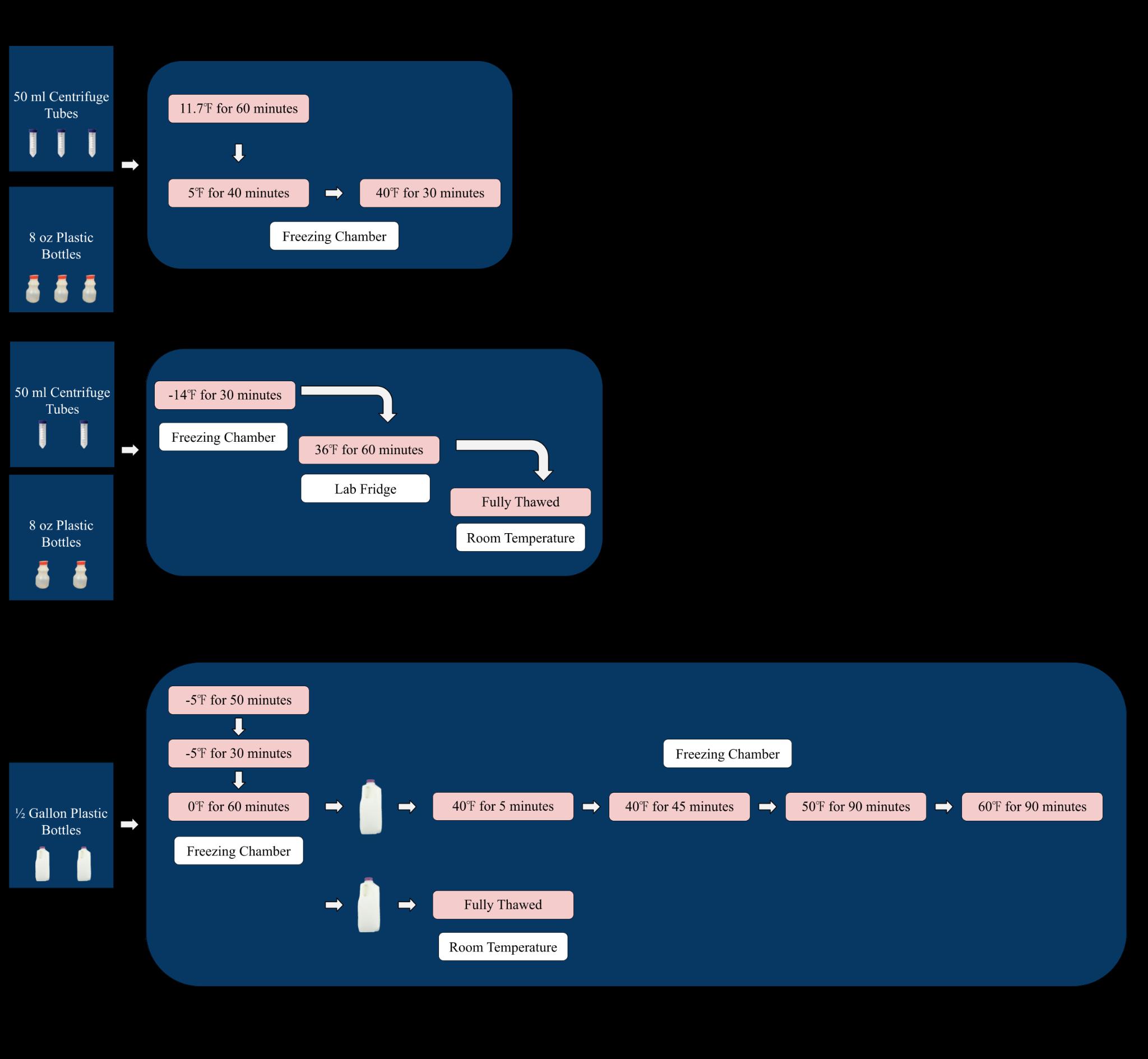 were thawed in the freezing chamber at 40℉ for 30 minutes (Figure 2A). The remaining two 50 mL centrifuge tubes and two 8 oz milk bottles were frozen in the laboratory's walk-in freezer at14.0℉ for 30 minutes (Figure 2B). The four tubes and bottles were initially thawed in the laboratory's walk-in refrigerator at 36℉ for 60 minutes, then placed at room temperature to fully thaw (Figure 2B). These four tubes and four bottles were put back in the walk-in fridge once thawed. Both ½ gallon milk bottles were frozen in the freezing chamber in the same conditions as one another. The temperature was brought to 5℉ for five minutes, then was brought to 5℉ for 30 minutes, and then dropped to 0℉ for 60 minutes (Figure 2C). The first ½ gallon bottle was thawed in the freezing chamber: the temperature was brought to 40℉ for five minutes, then was brought to 40℉ for 45 minutes, set to 50℉ for 90 minutes, brought once again to 60℉ for 90 minutes, and was finally placed out at room temperature to completely thaw (Figure 4). The second ½ gallon bottle was thawed at room temperature the entire time (Figure 2C).